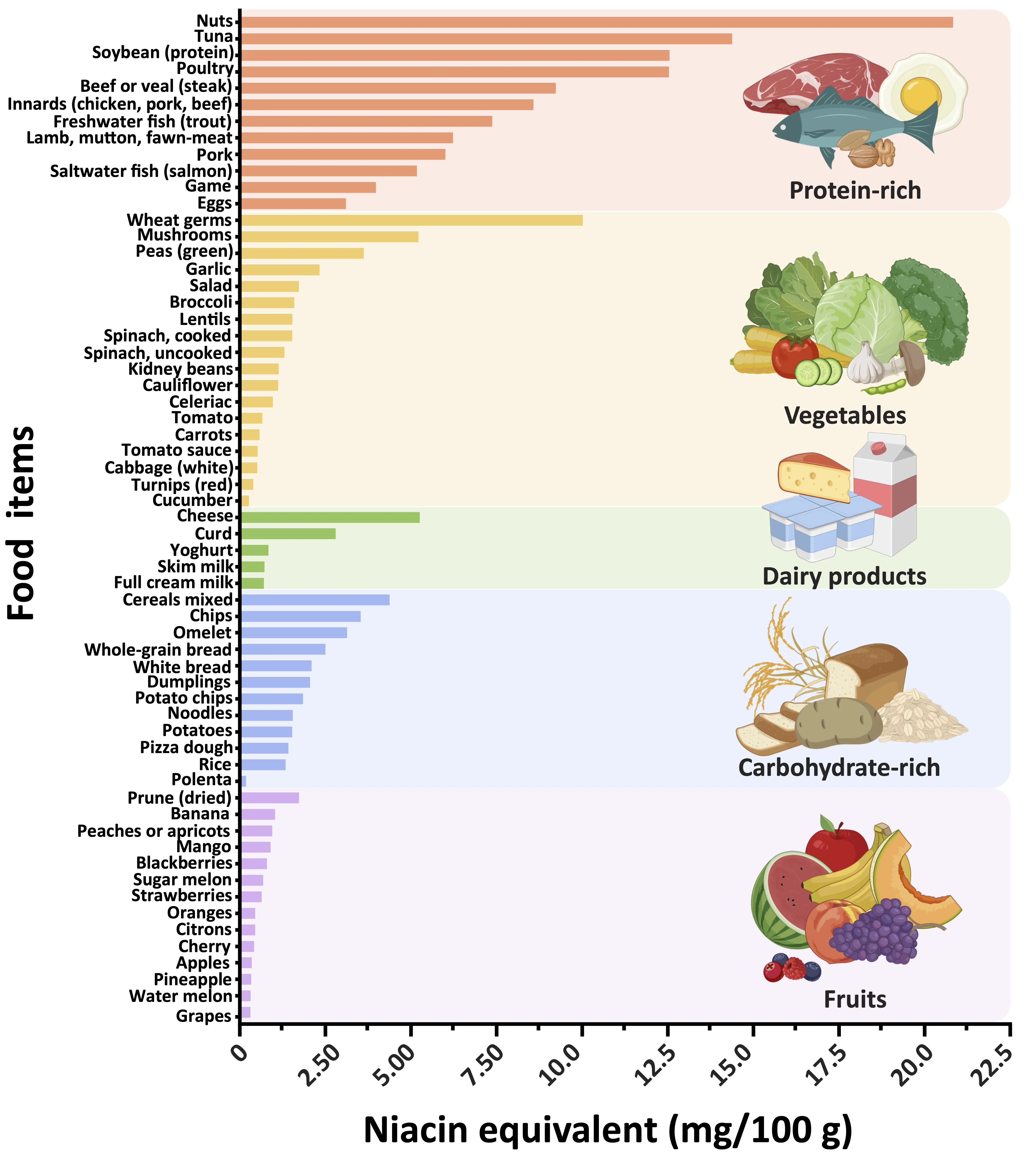 Figure 1. Classification of foods by category and their nutritional values for niacin equivalents. The graph depicts a range of selected foods, ranked based on their niacin equivalent content. The main dietary sources of NAD+ are nicotinamide and nicotinic acid, collectively referred to as preformed niacin. One milligram of niacin equivalents corresponds to either 1 mg of niacin or 60 mg of tryptophan. For similar food items (e.g., types of cheese), average values were calculated and grouped accordingly. Nutritional values for niacin equivalents were sourced from the German Nutrient Data Base (https://www.blsdb.de/; Federal Ministry of Food and Agriculture, Karlsruhe, Germany). Created in BioRender.com. NAD+: nicotinamide adenine dinucleotide.