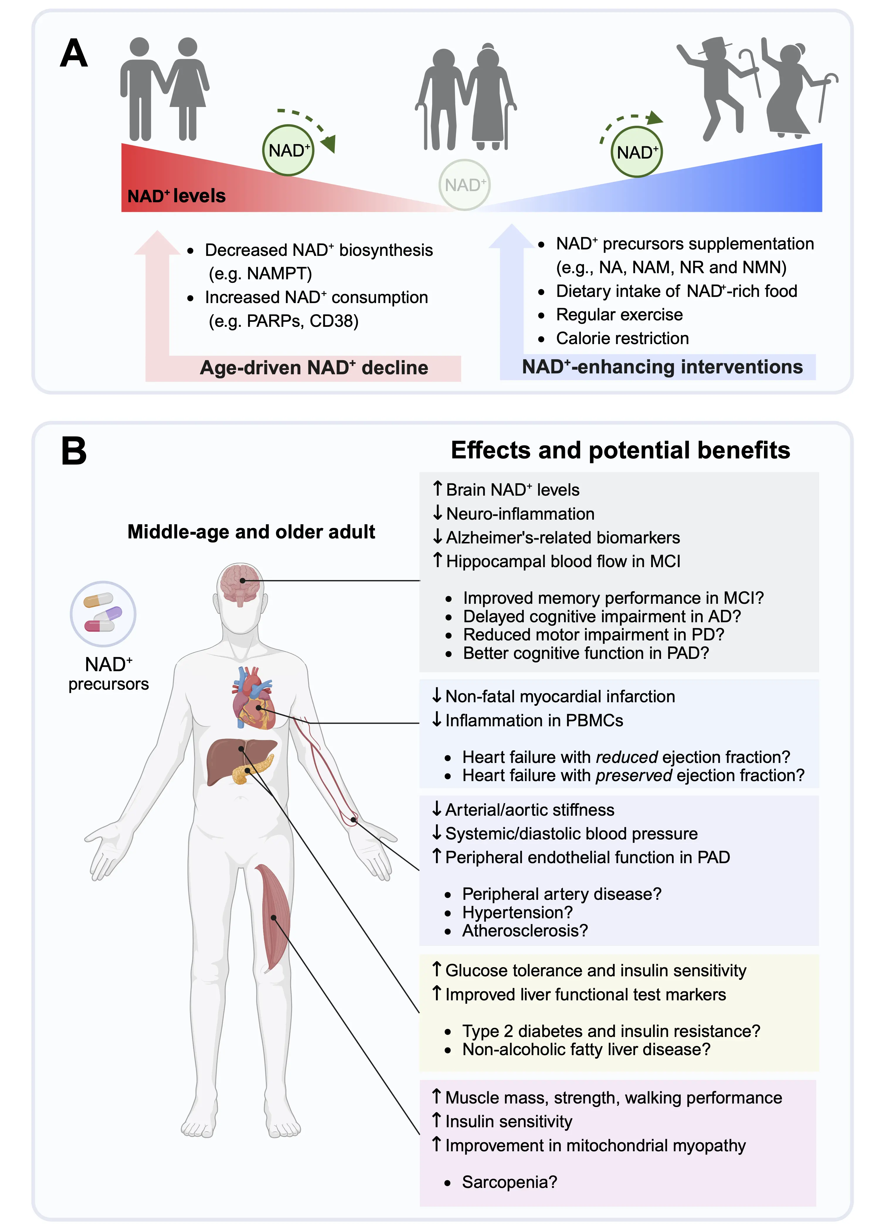 Figure 2. Clinical outcomes and potential benefits of NAD+ augmentation in age-associated disorders. (A) Aging is associated with a gradual decline of intracellular NAD+ levels due to reduced NAD+ biosynthesis, increased NAD+ consumption or both. NAMPT is the rate-limiting enzyme of the NAD+ salvage pathway and a key regulator of the intracellular NAD+ content. Major NAD+ consumers include PARPs, and cADPR synthase (e.g., CD38), and sirtuins. Potential interventions that increase cellular NAD+ content include NAD+ precursor supplementation, such as NA, NAM, NR, and NMN, increased intake of foods containing high levels of NAD+, regular physical exercise, and caloric restriction; (B) Effects and potential health benefits of NAD+ precursors supplementation in middle-aged and older adults. Arrows indicate effects that are up- or downregulated in response to NAD+ precursors supplementation, as demonstrated in clinical trials. Points indicate potential preventive and therapeutic benefits of NAD+ precursors to delay age-related diseases. Created in BioRender.com. NAD+: nicotinamide adenine dinucleotide; AD: Alzheimer’s disease; MCI: mild cognitive impairment; NA: nicotinic acid; NAM: nicotinamide; NAMPT: nicotinamide phosphoribosyltransferase; NMN: nicotinamide mononucleotide; NR: nicotinamide riboside; PBMCs: peripheral blood mononuclear cells; PD: Parkinson’s disease; PAD: peripheral artery disease; PARPs: poly(ADP-ribose) polymerases.