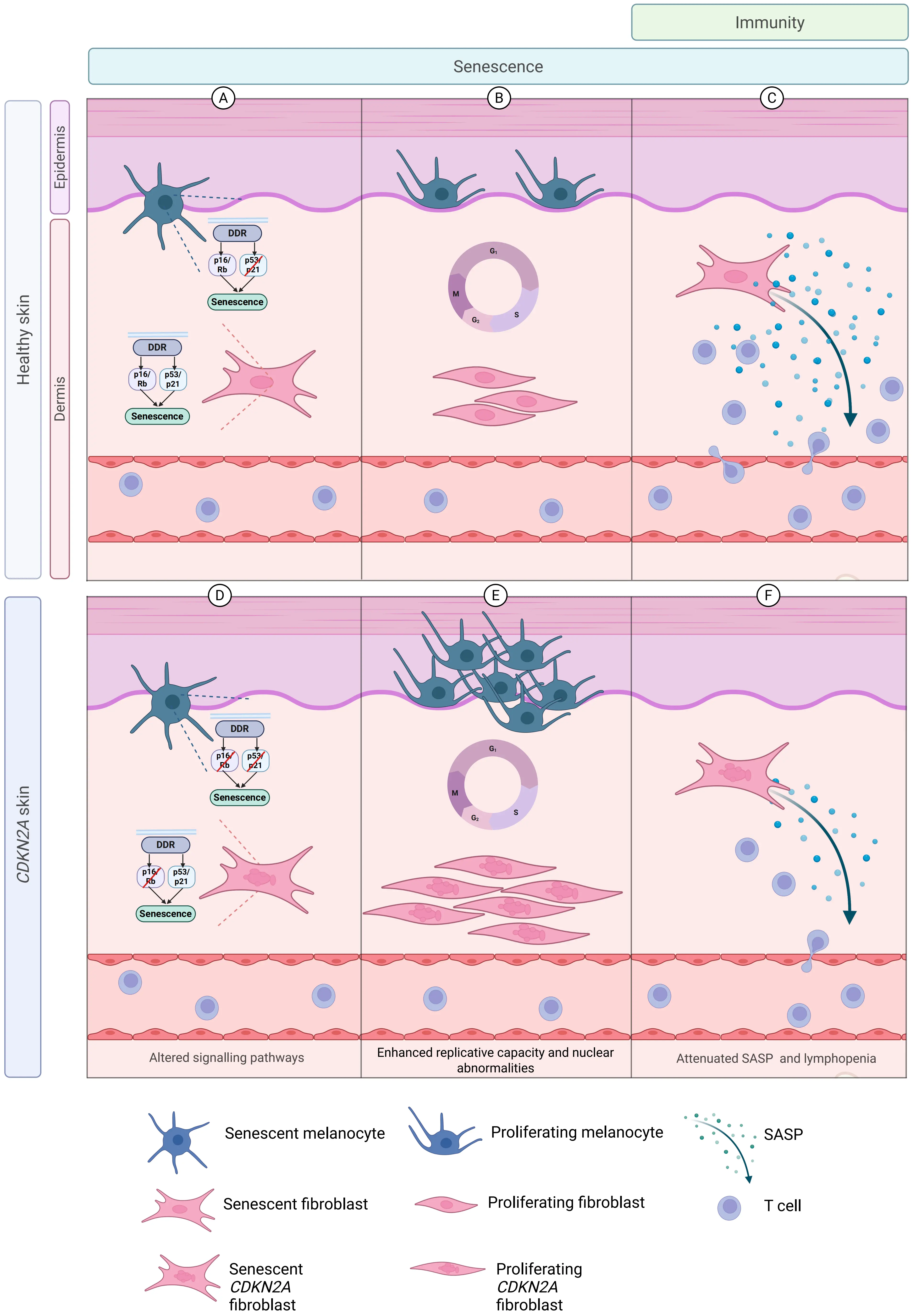 Figure 1. The germline CDKN2A mutation leads to multiple cutaneous abnormalities in senescence and immunity. Schematic showing alterations in the skin of individuals with the germline CDKN2A mutation. In skin from healthy individuals (A) Melanocytes preferentially recruit the p16 pathway to execute senescence, while fibroblasts can flexibly use both the p16 and p21 pathways; (B) Melanocytes and fibroblasts proliferate with normal nuclear architecture; (C) Senescent fibroblasts secrete a SASP rich in inflammatory proteins, chemokines and cytokines, with preserved numbers of resident memory T cells. Differences exist in baseline skin from individuals with the germline CDKN2A mutation in which (D) Both melanocytes and fibroblasts fail to upregulate p16 to effect senescence, while fibroblasts are able to recruit the p21 pathway in the context of p16 pathway redundancy; (E) Melanocytes and fibroblasts have increased replicative capacity, fibroblasts showing nuclear morphological abnormalities in pre-senescent and senescent states; (F) Senescent fibroblasts secrete less SASP with an associated reduction in numbers of cutaneous CD4+ and CD8+ T cells. Created in Biorender.com. SASP: senescence-associated secretory phenotype.