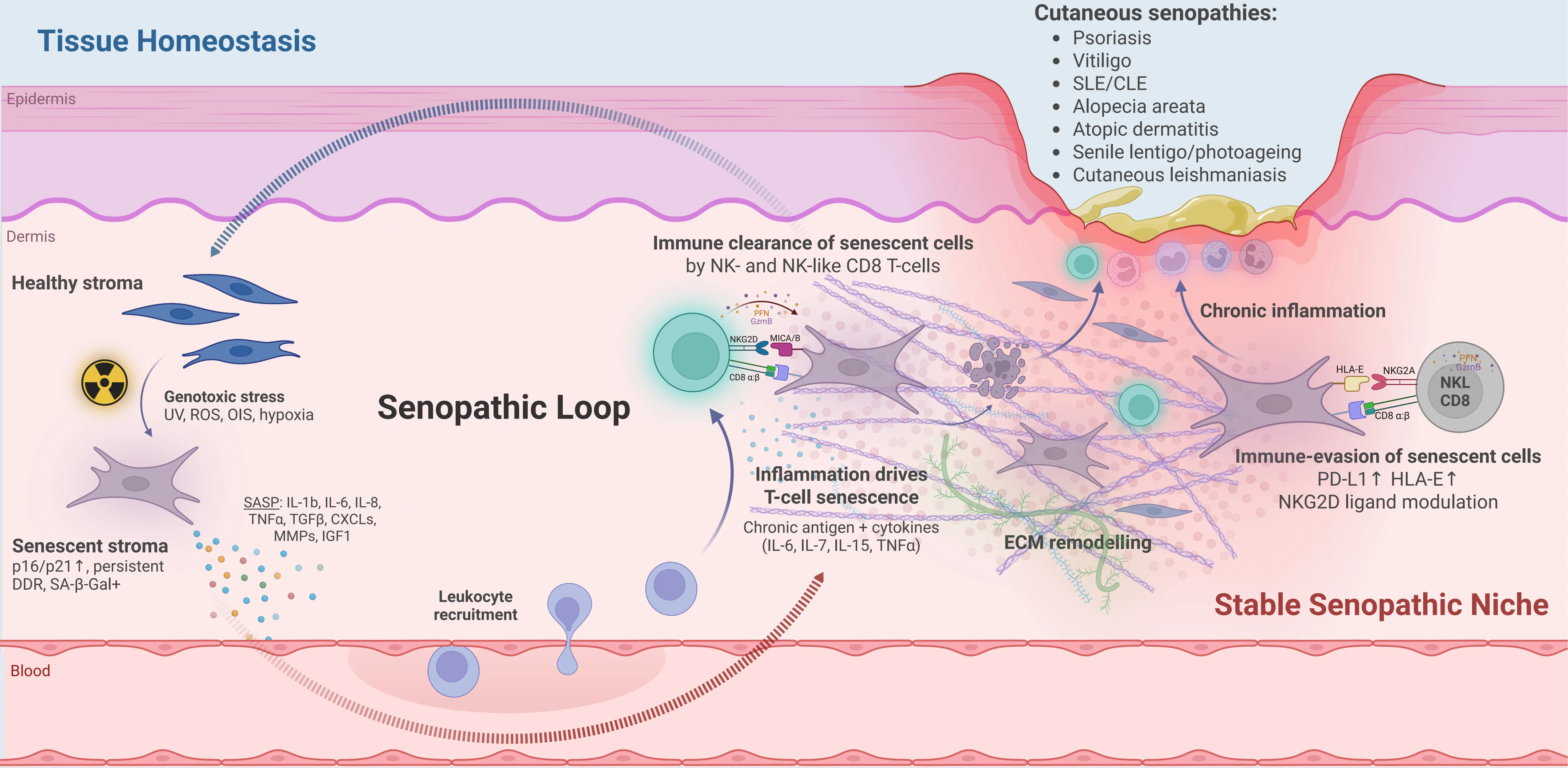 Figure 2. The senopathic loop and formation of a stable senopathic niche in human skin. Schematic cross-section of skin illustrating how cellular senescence in stromal and immune compartments regulates cutaneous immunity. Left: tissue homeostasis is disrupted by environmental and intrinsic genotoxic stressors—such as UV radiation, reactive oxygen species, oncogene-induced stress and hypoxia—which drive senescence in stromal cells (for example dermal fibroblasts)[21,25,162-166]. Senescent stromal cells are characterised by p16/p21 up-regulation, persistent DNA damage responses and SA-β-Gal activity[20,21,24,35]. These cells secrete a SASP rich in inflammatory cytokines, chemokines, growth factors and matrix metalloproteinases—for example IL-1β, IL-6, IL-8, IL-15, TGF-β, CXCL chemokines, MMPs and, under hypoxia, IGF-1—which recruit leukocytes from the circulation and remodel the extracellular matrix[45,60-62,114,167,168]. In human skin models, senescent dermal fibroblasts promote leukocyte recruitment and low-grade inflammation, reinforcing this loop[9,12]. Under effective immunosurveillance, NK and NK-like CD8⁺ T cells expressing activating NK receptors such as NKG2D recognise ligands including MICA/B on senescent stromal cells and mediate their clearance, thereby returning the tissue towards homeostasis[22,71,79,124-126]. Right: when SASP-driven inflammation is chronic, recruited T cells themselves acquire senescent, NK-like phenotypes in response to persistent antigen and cytokine exposure (for example IL-6, IL-7, IL-15, TNF-α), amplifying tissue damage[22,71,76,79,87,169]. Senescent stromal cells up-regulate immune checkpoint ligands such as PD-L1 and HLA-E[22,127,128,170], and senescent or stressed cells modulate NKG2D ligands—including shedding of MICA/B—creating an immunosuppressive, immune-evasive microenvironment that permits survival of both senescent stromal and lymphoid cells within a remodelled ECM[125,127,131,171,172]. This self-sustaining configuration constitutes a stable senopathic niche, in which persistent senescent cells and chronic inflammation reinforce one another, and is proposed to underlie “cutaneous senopathies” such as psoriasis[173-176], vitiligo[177], systemic/cutaneous lupus erythematosus[149,178], alopecia areata[179], atopic dermatitis/eczema[180], senile lentigo/photoageing[141], and cutaneous leishmaniasis, where stromal and/or T-cell senescence are directly linked to lesion burden and tissue injury[124,169,181]. Created in Biorender.com. SASP: senescence-associated secretory phenotype; UV: ultraviolet; SA-β-Gal: senescence-associated β-galactosidase.