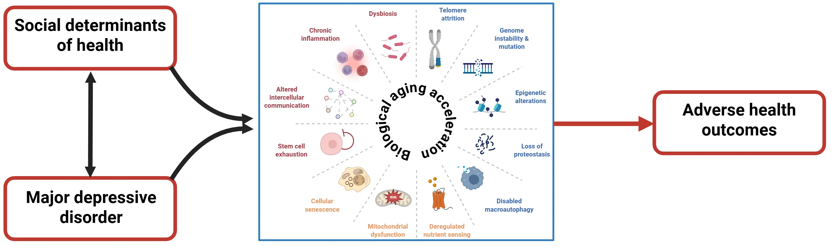 Figure 1. MDD and SDH are closely related phenomena, showing a bidirectional relationship. They have both independent and synergistic effects on multiple hallmarks of biological aging, contributing to accelerated biological aging observed in these individuals. In turn, the accelerated biological aging can be one of the mechanisms that explains the higher incidence of adverse health outcomes (e.g., medical multimorbidity, and premature mortality) that are associated with both MDD and worse SDH in the general population. MDD: major depressive disorders; SDH: social determinants of health.
