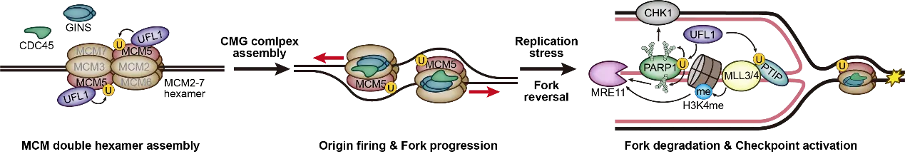 Accurate genome duplication is essential for life continuity and the maintenance of genetic stability. DNA replication proceeds through initiation, elongation, and termination, relying on the coordinated actions of numerous replication factors[1,2]. Among them, the CDC45–MCM–GINS (CMG) helicase unwinds the DNA duplex and powers fork progression. In the canonical model, origin licensing during G1 establishes MCM2-7 double hexamers, whereas DDK- and CDK-mediated phosphorylation in early S phase triggers the recruitment of CDC45 and GINS to form the active CMG helicase[3]. Despite this well-defined framework, how post-translational modifications (PTMs) fine-tune CMG activation at the molecular level has remained unclear.