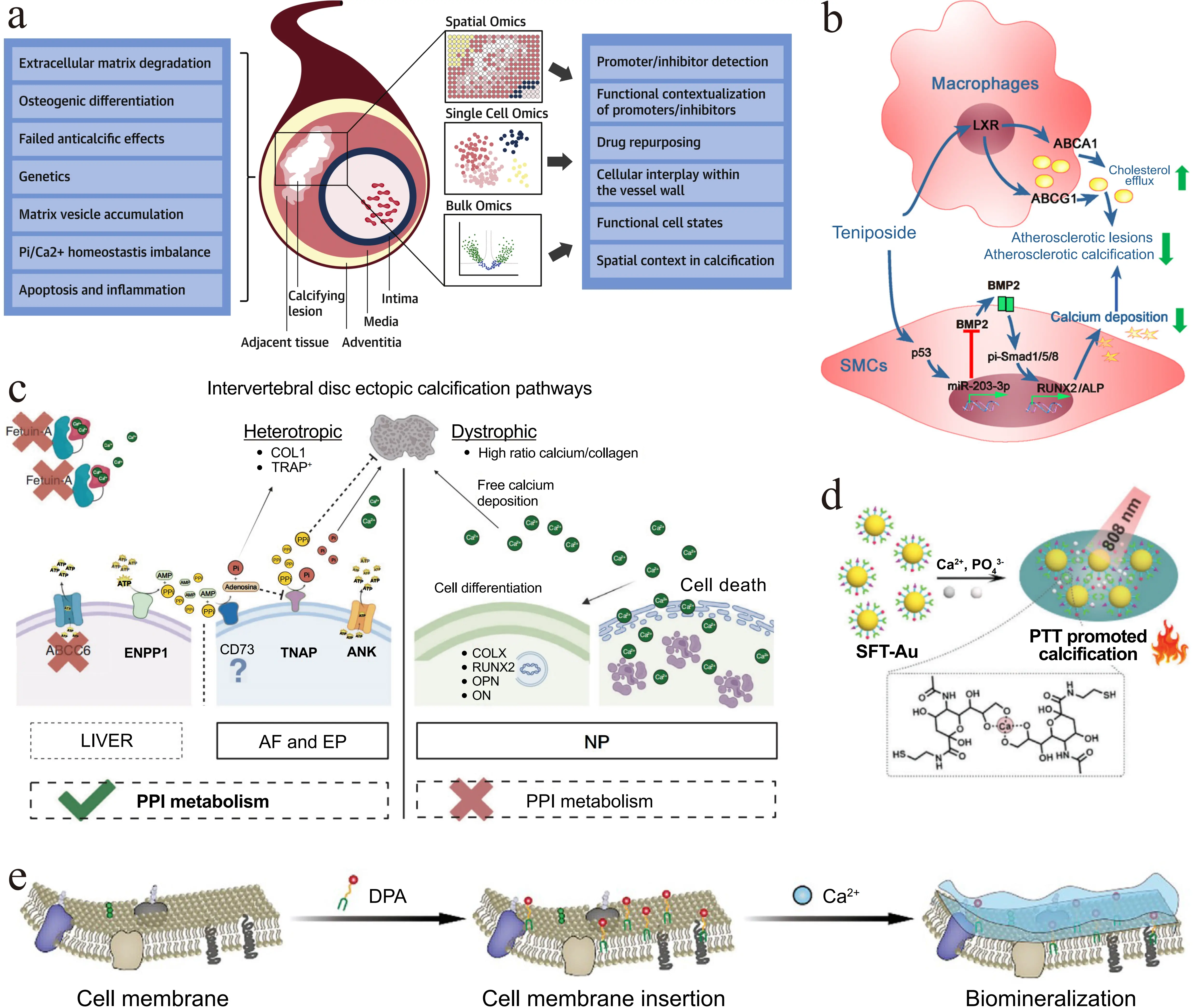 Figure 1. Mechanisms of calcification formation and calcification-related therapeutic strategies. (a) Arterial intimal calcification[4]; (b) Mechanisms of teniposide in inhibiting atherosclerosis and vascular calcification[5]; (c) Primary pathways of extradiscal calcification[6]; (d) Calcification-dependent photothermal therapy for treating tumors. Republished with permission from[7]; (e) Treatment of osteosarcoma via a versatile polymer-induced calcification approach. Republished with permission from[8]. LXR: liver X receptor; BMP2: bone morphogenetic protein 2; ABCA1: ATP-binding cassette transporter A1; ABCG1: ATP-binding cassette transporter G1; SMCs: smooth muscle cells; ALP: alkaline phosphatase; ABCC6: ATP binding cassette subfamily C member 6; ENPP1: ectonucleotide pyrophosphatase/phosphodiesterase 1; COL: collagen; TRAP: tartrate-resistant acid phosphatase; TNAP: tissue non-specific alkaline phosphatase; ANK: ankylosis gene; AF: annulus fibrosus; EP: endplate; PPI: inorganic pyrophosphate; PTT: photothermal therapy; SFT-Au: surface-functionalized gold nanoparticles; DPA: DSPE-PEG-ALN.