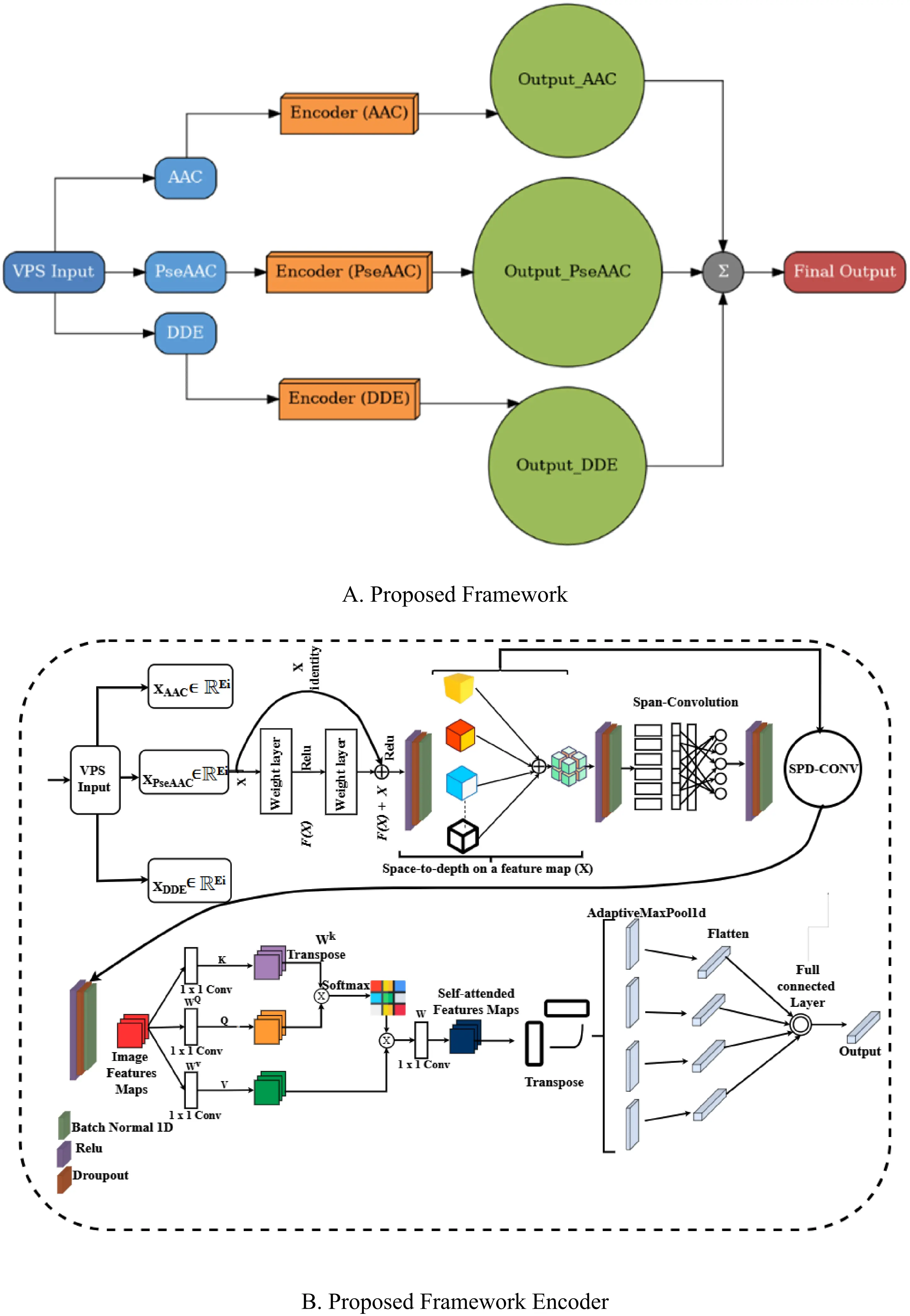 In Figure 1, Block A represents the general architecture of our proposed model, SpanAttNet, which integrates multiple biochemical descriptors (AAC, PseAAC, and DDE). Each descriptor is first processed independently through its dedicated encoder before the outputs are fused using three different operators, concatenation (Equation 9), the maximum (Equation 10), and summation (Equation 11), to enhance the learning capacity of the framework. In contrast, Block B details the workflow of a single descriptor encoder. This block illustrates how a specific descriptor is transformed, starting from feature embedding, passing through the span-based attention mechanism, and ultimately being mapped to a compact representation. Thus, Block A illustrates the global model design (descriptor fusion across encoders), while Block B explains the internal processing pipeline of an individual encoder. This distinction highlights how the proposed architecture leverages both feature-specific learning and integrated descriptor fusion to achieve improved performance.