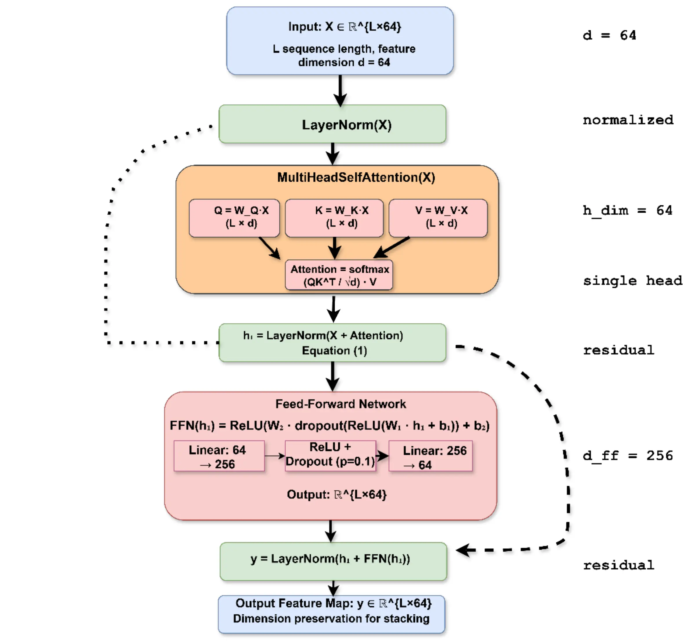 In our implementation, we use a single attention head (instead of multi-head) with a hidden dimension of 64, followed by a two-layer feed-forward network (64 → 256 → 64) with ReLU activation and dropout (p = 0.1). Both the attention sub-layer and the feed-forward sub-layer are wrapped in residual connections and layer normalization, as illustrated in Figure 2. In this study, residual self-attention is primarily employed as a representation-learning mechanism to enhance robustness and performance, rather than as an explicit tool for residue-level biological interpretation.