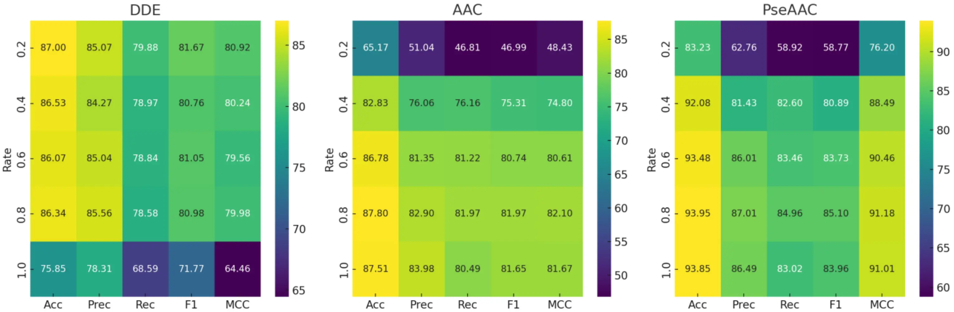 Figure 3. Performance metrics of feature descriptors at varying PCA reduction rates (ρ). PCA: principal component analysis; DDE: dipeptide deviation from expected mean; AAC: amino acid composition; PseAAC: pseudo-amino acid composition.