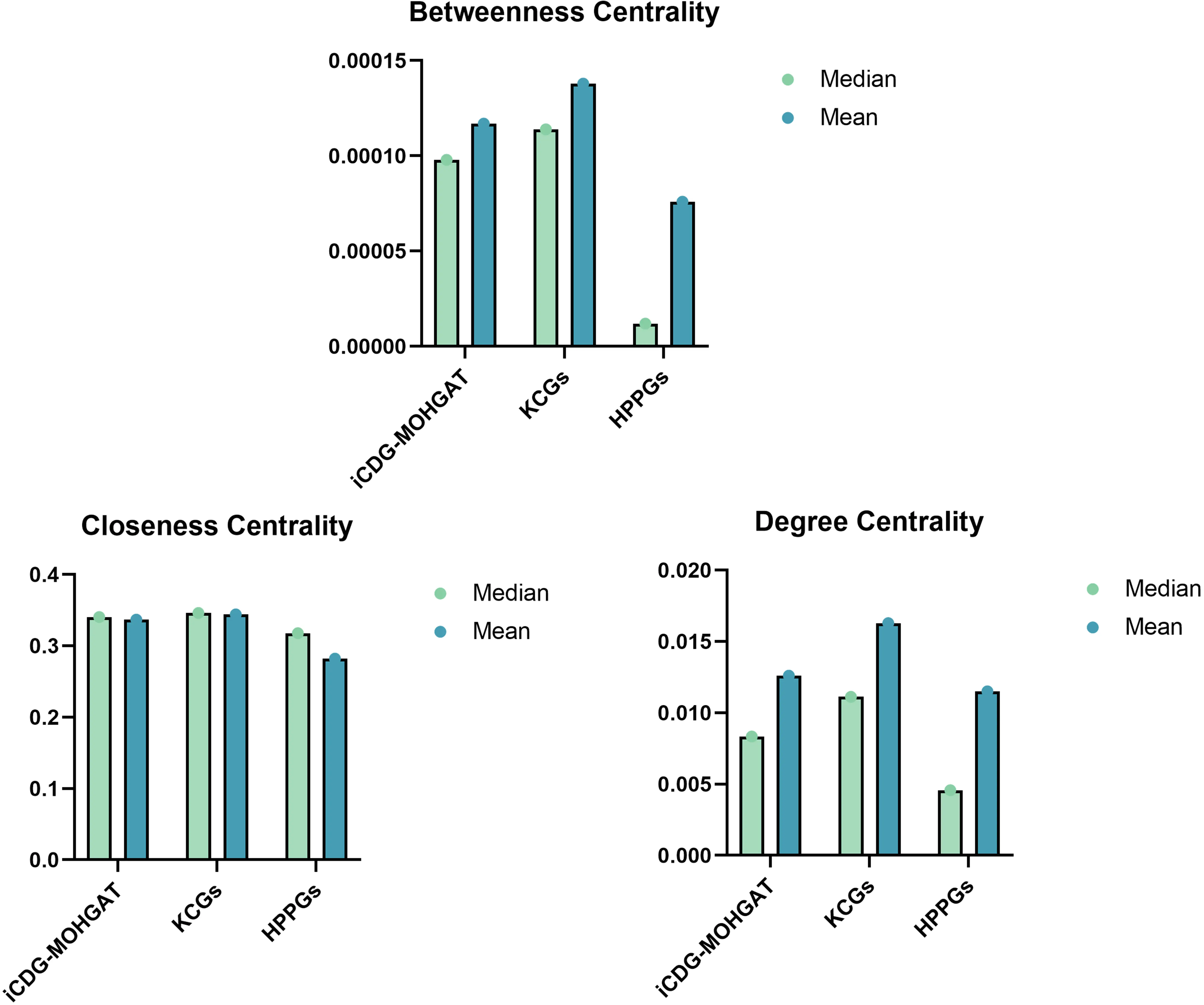 To further evaluate model performance, the importance of genes is considered to be highly correlated with their centrality in the network according to the rules of centrality lethality. As shown in Figure 10, based on the constructed multidimensional gene network, we calculated three centrality indicators for each gene: degree centrality, proximity centrality, and betweenness centrality. Most of the predicted driver genes were found to be significantly more central than HPPG (high-probability passenger genes).