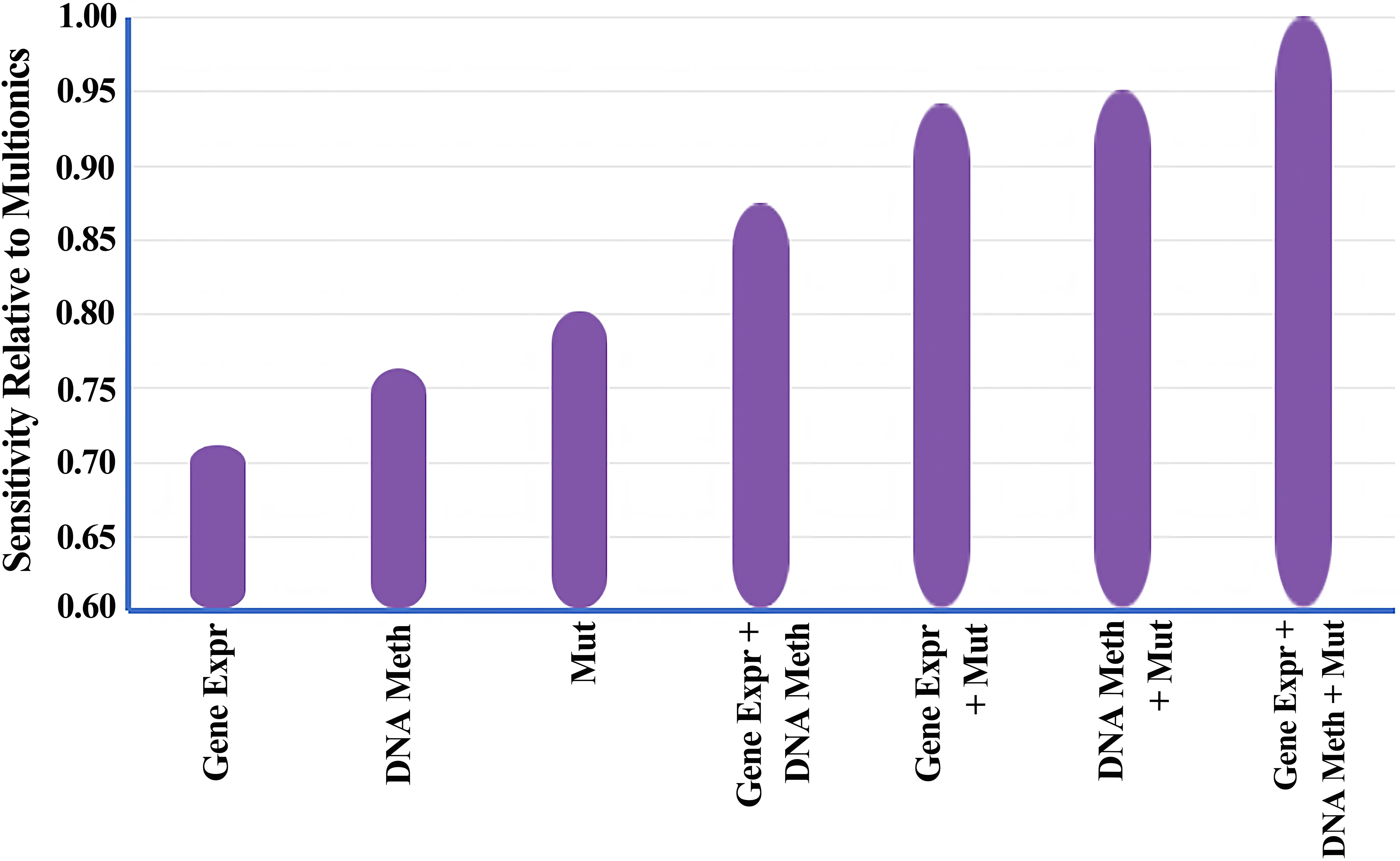 The perturbation experiments underline the vital and indispensable role played by both network structure and omics characteristics in ensuring the accuracy of the model. Additionally, by systemically employing three types of omics and five subsets of networks on the MG-STRING PPI network to train the model, and independently measuring its AUPRC value, it was evident that a gradual enhancement in predictive performance emerged with the integration of more omics types and networks. When selecting omics data, models utilizing only one omics type showed a notable decline in performance across all configurations, except for the model that utilized only Mut (Table 1), which accentuated the paramount importance of mutation rate in the classification of cancer genes, aligning with prior expectations. To further validate the advantages of using multi-omics data, we utilized the iCDG-MOHGAT model, which was trained on subsets of omics types, in tandem with the MG-STRING PPI network, to compute the percentage of known cancer genes included in each model's predictions (sensitivity), as depicted in Figure 4. The bar graph illustrates the sensitivity scores of each model relative to the full multi-omics setup, sorted by their sensitivity. For instance, a value of 0.90 suggests that the iCDG-MOHGAT, when trained on that specific omics subset, can attain 90% of the sensitivity exhibited by the comprehensive model. We found that the iCDG-MOHGAT's sensitivity on subsets of omics types was consistently lower in comparison to a complete multi-omics setup, with gradual increases as additional omics information was incorporated, further corroborating our standpoint.