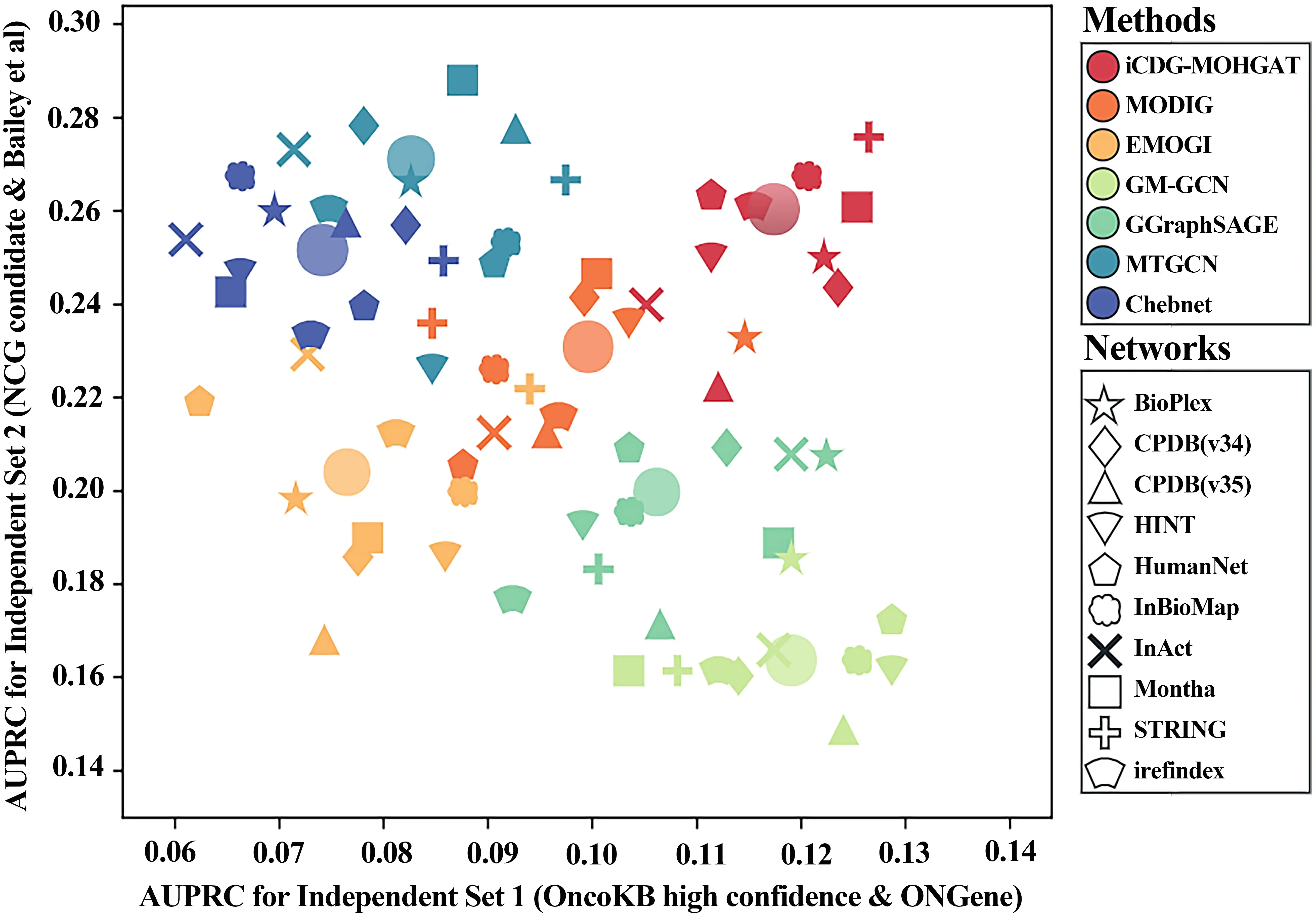 To investigate whether the performance of the model is biased towards a particular dataset, we collected two additional cancer gene sets from other sources and constructed two independent test sets for benchmarking different methods. As shown in Figure 5, the first group (independent group 1) includes validated cancer genes with oncogenic effect annotations from OncoKB and cancer genes from ONGene. The second group (independent group 2) includes candidate cancer genes from NCGs that do not overlap with known cancer gene sets. We compared them on two separate datasets. The results showed that iCDG-MOHGAT exhibited robustness across different cancer gene sets.