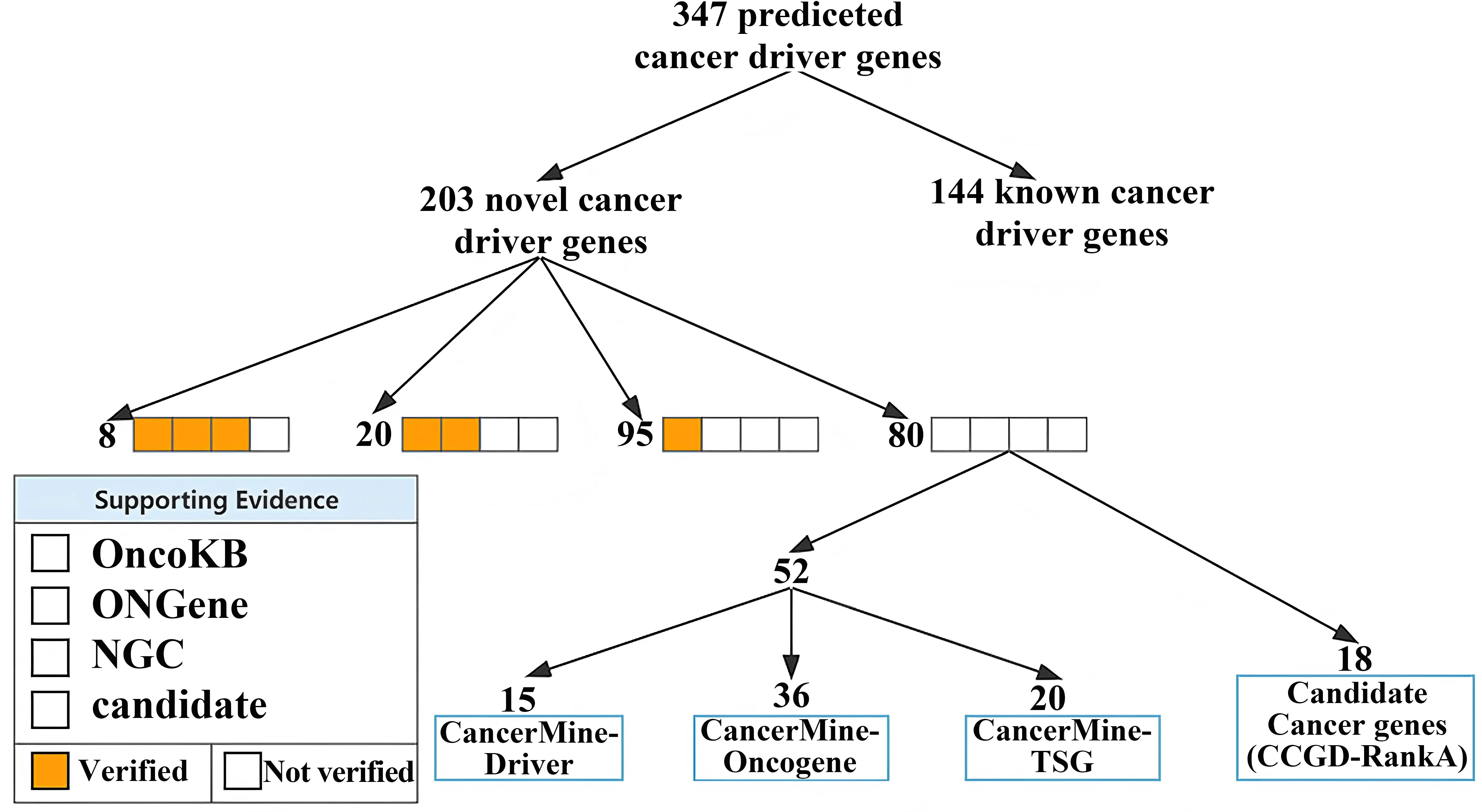 Cancer is a disease that occurs at the genetic level. It is caused by mutations in genes that control cell function, especially the growth and division of cells[1]. The heterogeneous and dynamic nature of cancer presents a serious challenge to cancer treatment. At the same time, the interaction and dynamic changes between cancer and the microenvironment make the treatment of cancer more complex and arduous. With the development of research, it has been found that cancer driver genes can give cells growth benefits and affect the transformation process from normal cells to cancer cells, which provides us with new research ideas, and identification of cancer driver genes is of great significance in understanding the pathogenesis of cancer, improving the accuracy of cancer diagnosis, and guiding precise treatment[2].