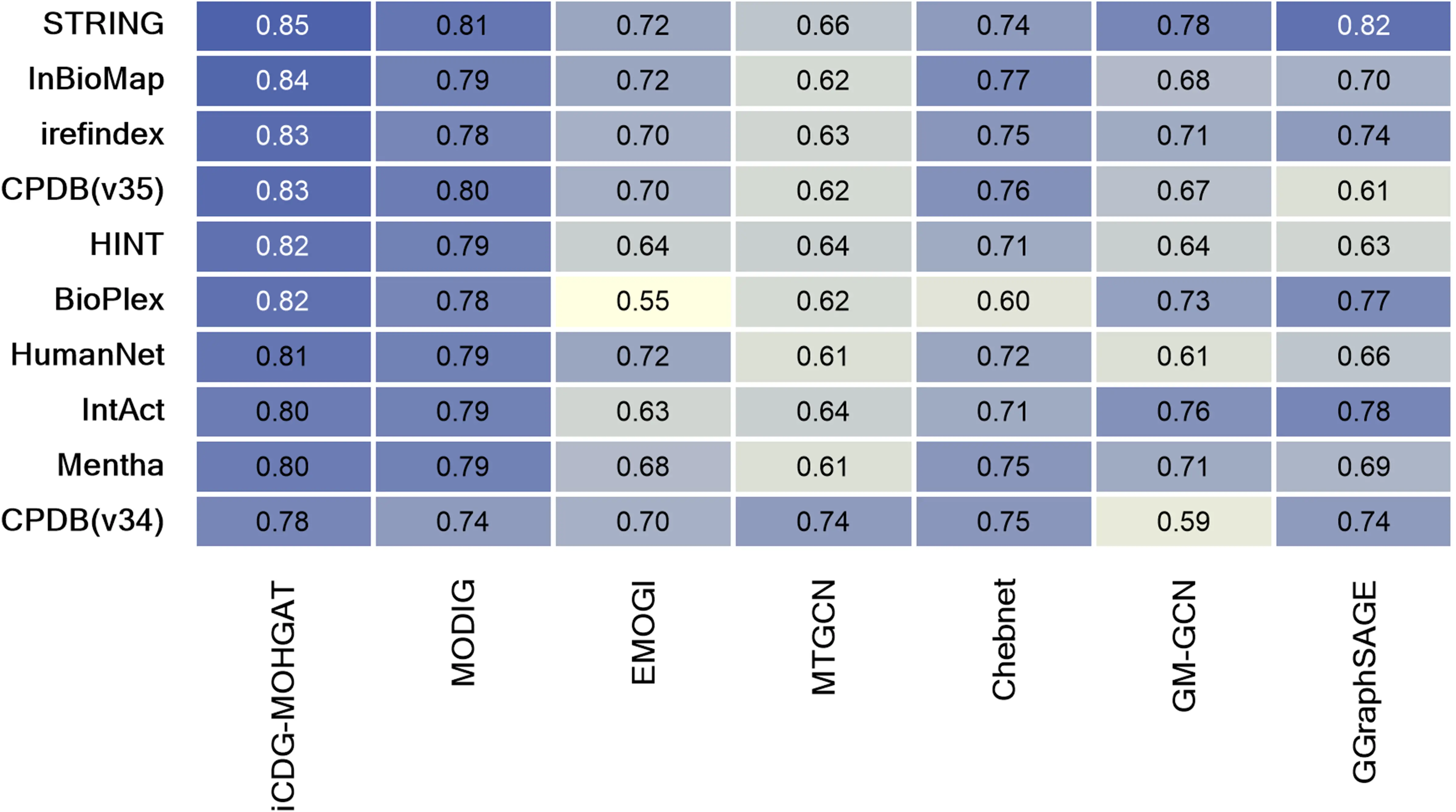To evaluate the superiority of iCDG-MOHGAT, we conducted a five-fold cross-validation ablation experiment on MG-STRING. The results are shown in Table 1. We observed that integrating more diverse gene association maps into the construction of the multidimensional gene network significantly improved the model’s performance, and iCDG-MOHGAT achieved the best performance when integrating the multidimensional gene network and disease network with all five gene association maps. Subsequently, we compared randomly generated input features and found that multi-omics features can improve prediction performance. When we replaced HGAT with GAT and GCN, the model’s performance dropped significantly, indicating that HGAT and the fusion learning module are indispensable in iCDG-MOHGAT.
