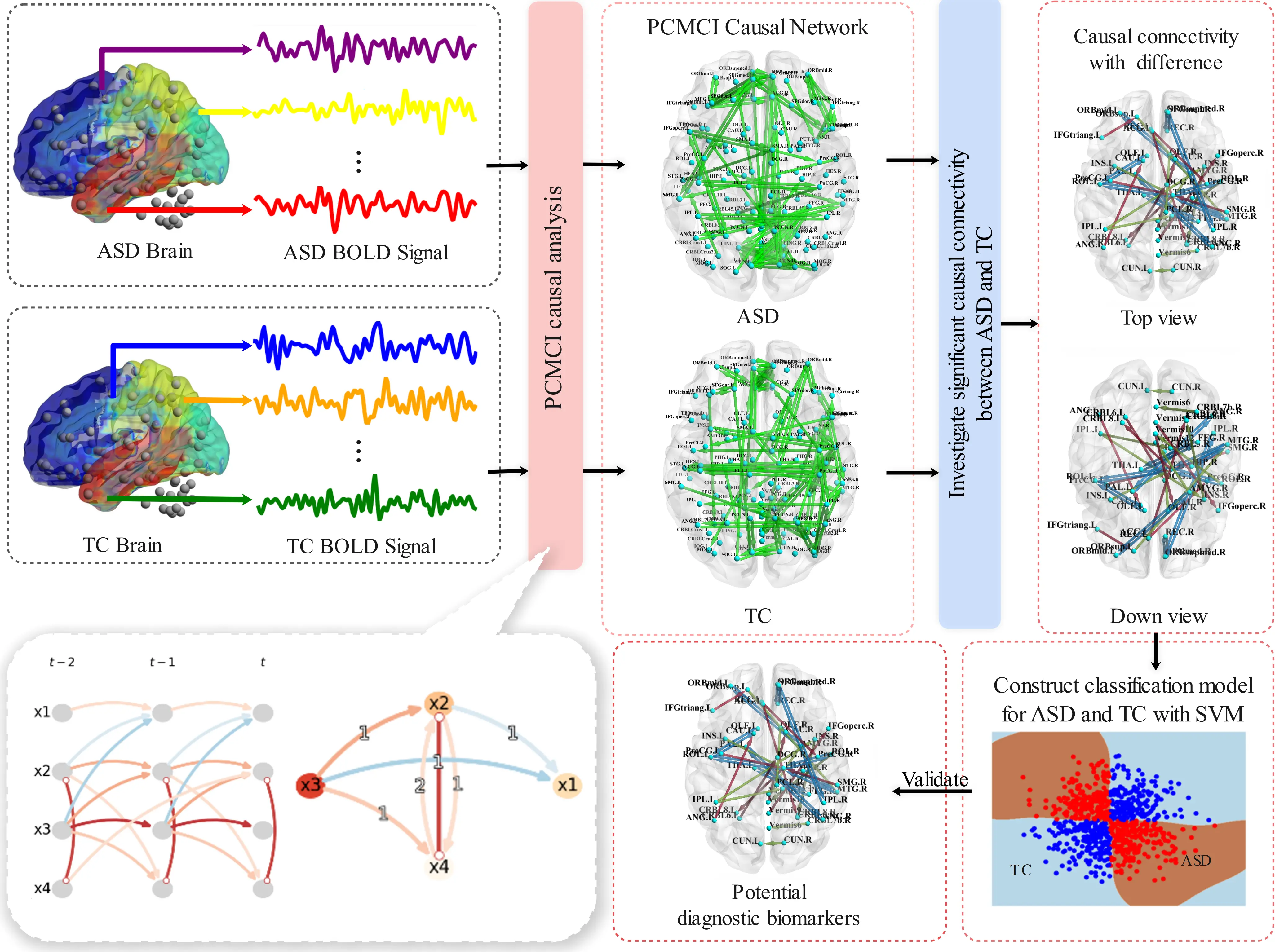 We construct the PCMCI-SVM model to analyze the brain image data to identify diagnostic biomarkers for ASD through causal network analysis. This model can reveal the causal relationships and information transfer pathways among different brain regions, which provides a new perspective for us to deeply understand the complexity of the brain and mechanisms underlying diseases.