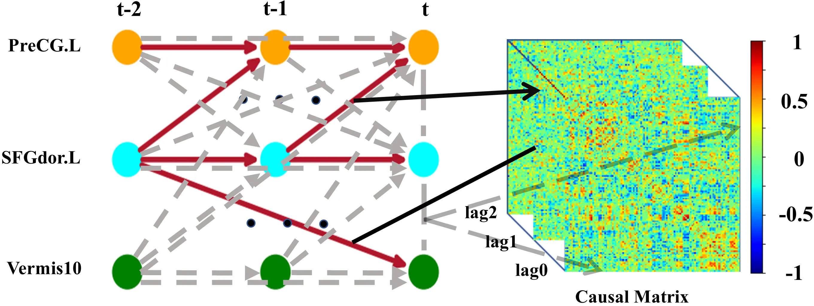 Through these two steps, a time series graph presenting causal relationships between brain regions is constructed, from which we obtain a PCMCI directed causal matrix for each participant (Figure 2). Based on the matrix, we construct a brain PCMCI causal network where the nodes are brain regions and the weights of the edges are the causal connection values.