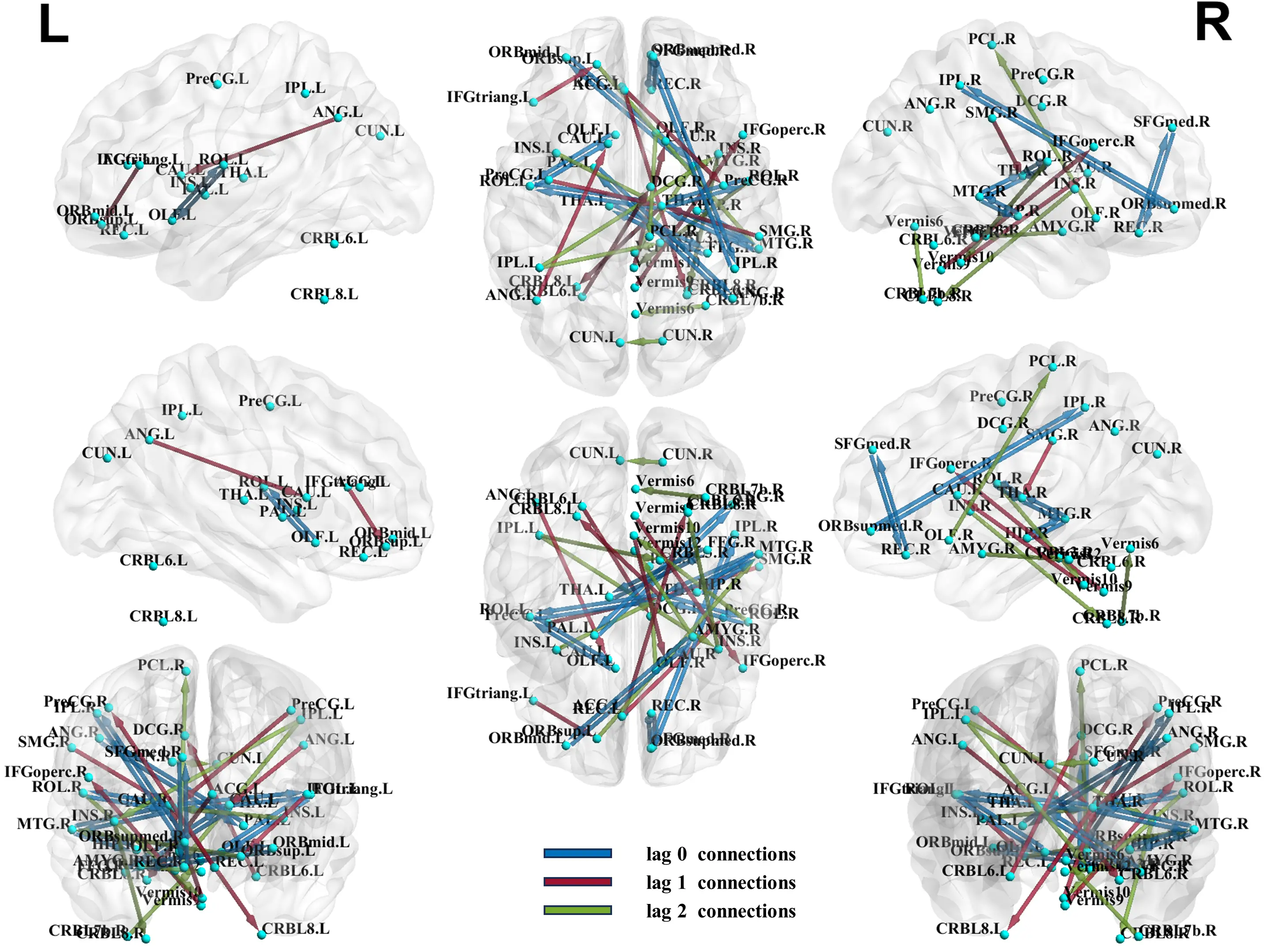 After applying the PCMCI algorithm, the causal relationships of brain regions are determined, and based on p-values from two-sample t-tests, we obtain the top 10 causal connections for each lag in the PCMCI causal network (Figure 3). Accordingly, we obtained the 30 most significant causal connections for baseline methods: spDCM (Table S2), Granger causal analysis (Table S3), TE (Table S4), and Liang-Kleeman information flow (Table S5). Table 2 lists these causal connections with significant differences and the changes in the ASD group compared with the TC group. Among them, right thalamus (THA.R) exhibits more causal connections with significant differences, including: [THA.R-left rolandic operculum] (lag 0), [right middle temporal gyrus (MTG.R)-THA.R] (lag 0), [right rolandic operculum (ROL.R)-THA.R] (lag 0), [PreCG.L→THA.R] (lag 1), [right supramarginal gyrus (SMG.R)→THA.R] (lag 1), [THA.R→Cerebelum.8.L (CRBL8.L)] (lag 1), [left insula (INS.L)→THA.R] (lag 2). Additionally, [left inferior parietal but supramarginal and angular gyri (IPL.L)→right insula (INS.R)] (lag 2) belongs to the dorsal attention network[25,26]. [Right cuneus (CUN.R)→left cuneus (CUN.L)] (lag 2) belongs to the visual network[27]. These connections may affect the functional integrity of the corresponding subnetworks. Here, “-” indicates a contemporaneous connection goes both ways, “→” indicates the direction of causality obtained according to the time-sequential relationship, “[]” indicates the causal connection between two regions.