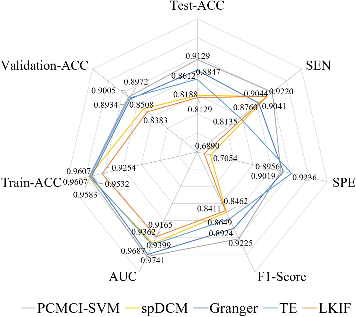 Comparative analysis reveals that the PCMCI-SVM model achieves the highest sensitivity (SEN = 92.20%) among all methods (spDCM, Granger, TE, LKIF, and PCMCI-SVM), indicating superior capability in identifying ASD (Figure 4). Furthermore, the PCMCI-SVM model demonstrates optimal performance on classifier-specific metrics, attaining the highest F1-Score and AUC values. However, PCMCI-SVM (SPE = 89.56%) exhibits lower specificity than Granger (SPE = 90.19%) and TE (SPE = 92.36%), suggesting relatively weaker performance in recognizing TCs. When evaluating feature extraction methods independently, PCMCI features yield the highest mean classification accuracy (91.29%) across all comparative methods. Notably, the SVM classifier consistently outperforms alternative classifiers (RF and KNN) regardless of feature type (spDCM, Granger, TE, LKIF, or PCMCI-SVM).