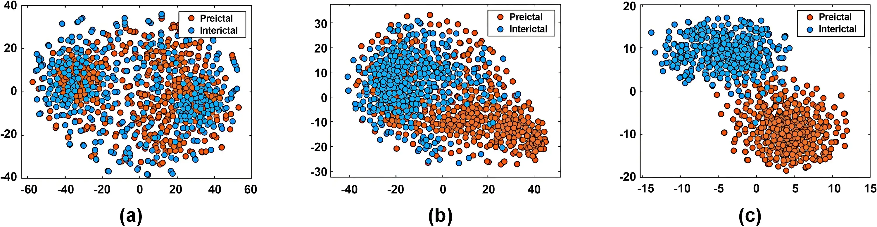 We further employed t-distributed stochastic neighbor embedding (t-SNE) to visualize the feature distribution learned by different model components, as shown in Figure 4. Each point represents an EEG sample, with orange indicating preictal and blue indicating interictal states. Figure 4a displays the embeddings derived from raw EEG samples, showing substantial overlap between the two classes. Figure 4b presents the feature embeddings learned by the BiLSTM layer, which exhibit more organized clustering with tighter intra-class grouping and increased inter-class separation. Figure 4c shows the embeddings from the complete Attention-BiLSTM, demonstrating further improved separation between preictal and interictal samples, with more compact and distinct clusters. These visualizations collectively illustrate the progressive enhancement in class separability achieved by our approach.