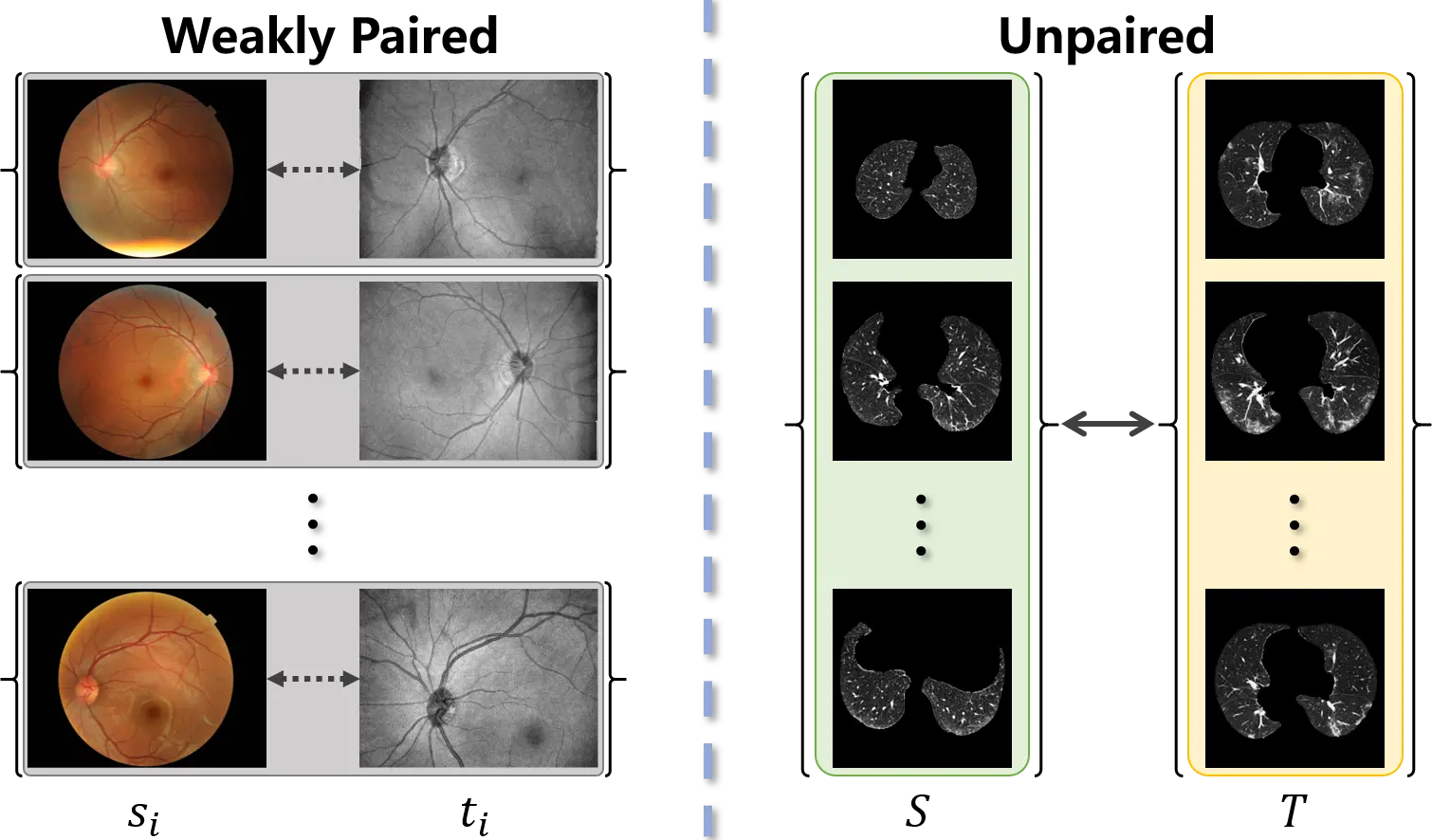 The acquisition of training data for image-to-image translation is a formidable task in medical scenarios. Most of the applications based on image-to-image translation follow one of two fundamental frameworks, namely pix2pix[5] and CycleGAN[6], depending on whether the training data are paired or unpaired. As pix2pix is trained under supervision, paired input-output samples are necessary for its implementation. However, such a training set is hard to obtain in practice. Many factors, such as divergence between individuals, changes with time, and differences in imaging mechanisms, will lead to misalignment of the images. Consequently, as shown in Figure 1, weakly paired data (pairwise captured and sharing an overlapping field of view) and unpaired data (independently collected) are more common in medical images. To mitigate the limitation of image-to-image translation and make full use of available data, CycleGAN was proposed to translate an image from a source domain to a target domain in the absence of paired examples. Although weakly paired and unpaired data have been successfully utilized to perform image-to-image translation, the distribution bias between the source and target samples has not been overcome.