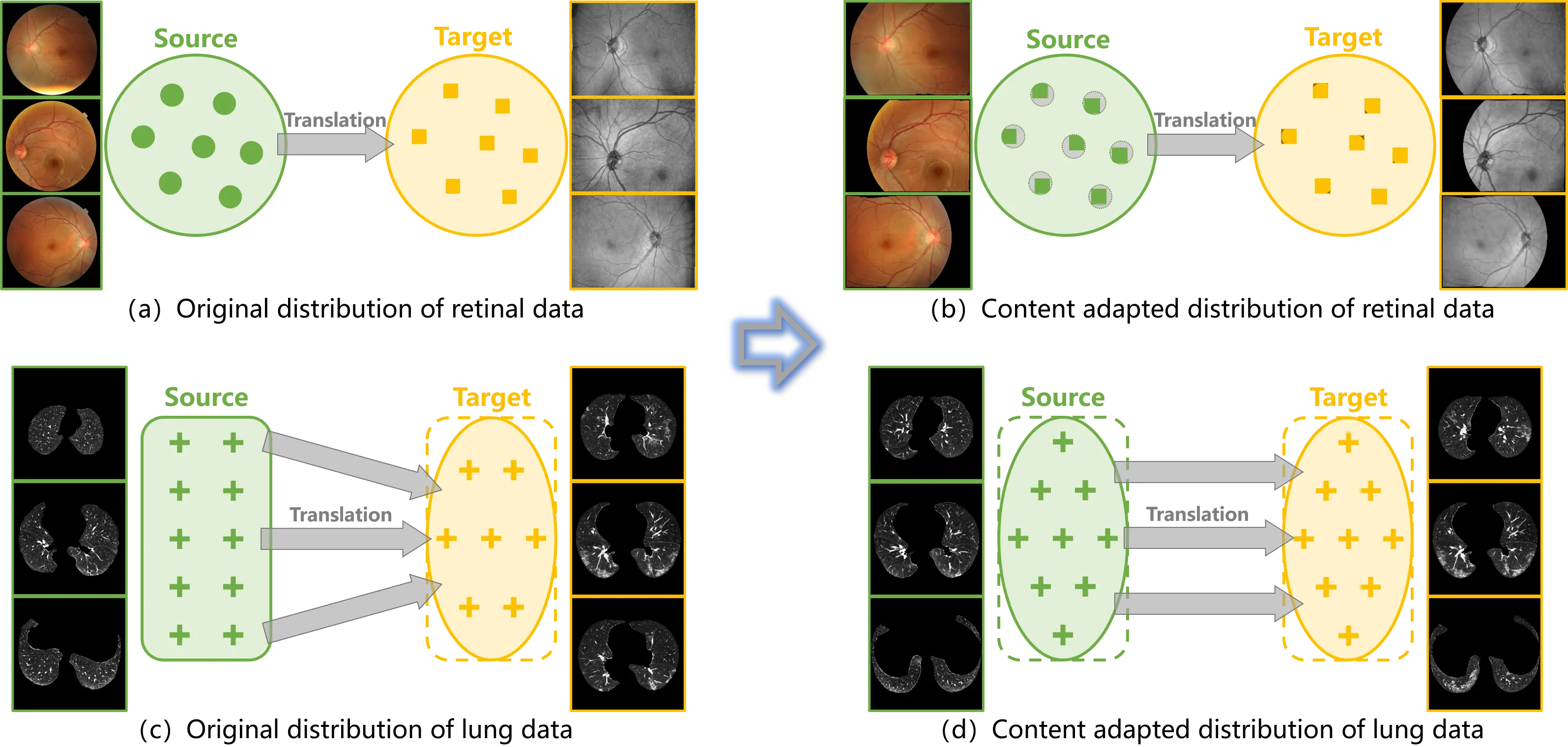Figure 2. (a) (c) Distribution bias is embedded in the original data and misleads the training of translation models; (b) (d) Content adaptation corrects the distribution bias between the source and target samples, such that the translation models are properly trained.