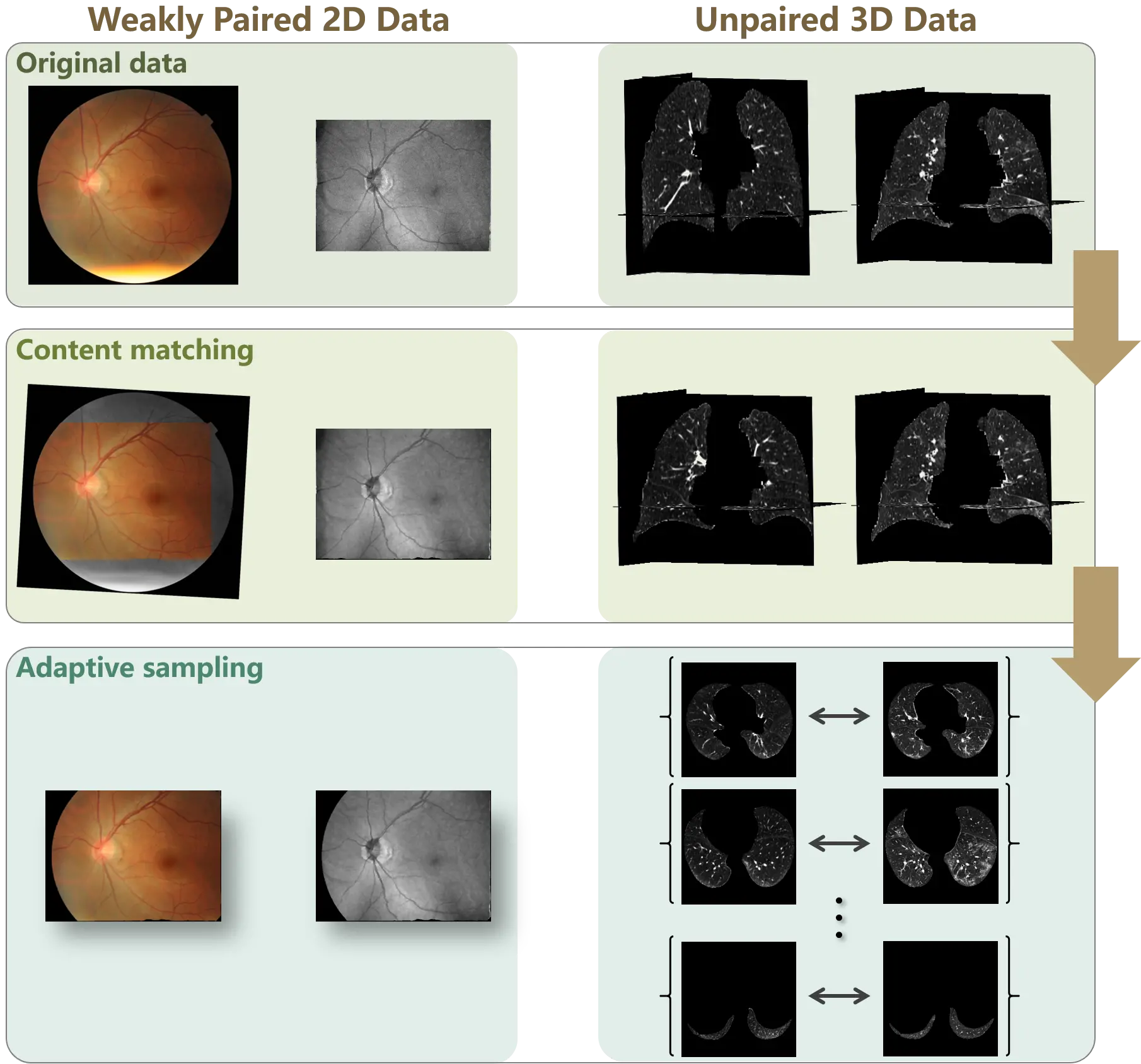 For weakly paired 2D data, each individual sample obeys the characteristic of the corresponding domain. Therefore, after aligning the global structure using content matching, adaptive sampling is implemented by straightforwardly capturing the overlapping field of the source and target samples to construct paired samples.