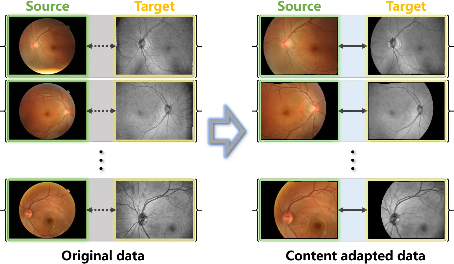 Figure 4. Examples of the original weakly paired retinal data and the content adapted data. Content adaptation matches the source and target samples and constructs paired samples.