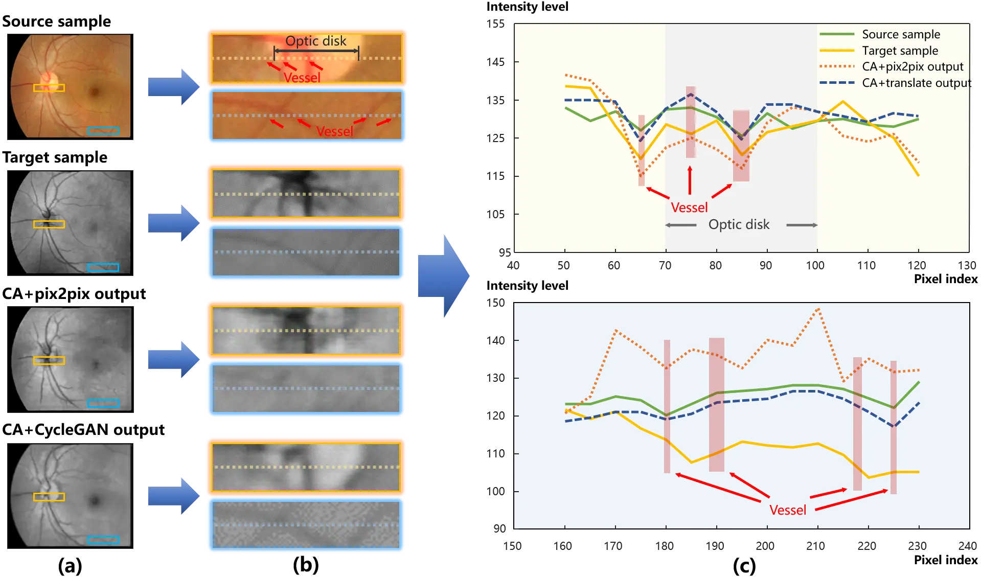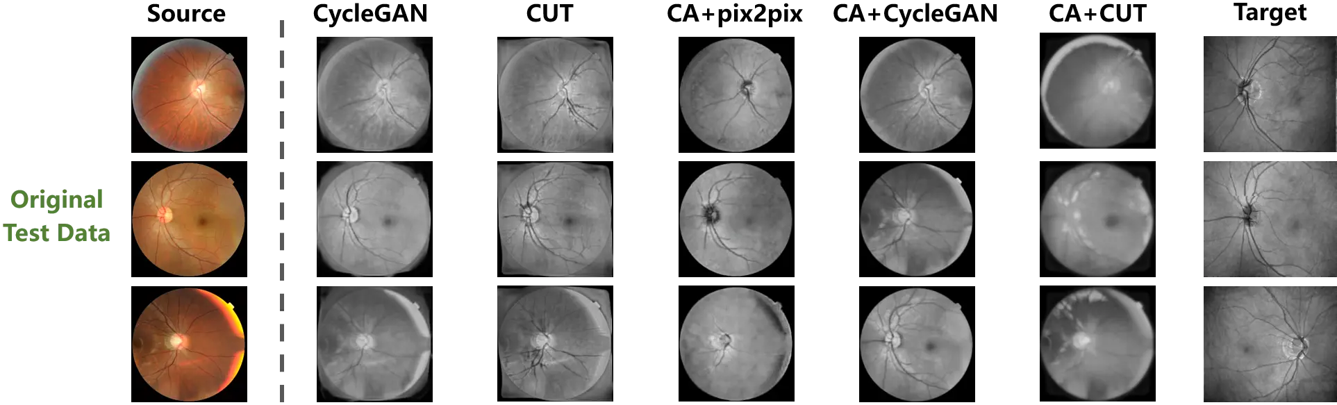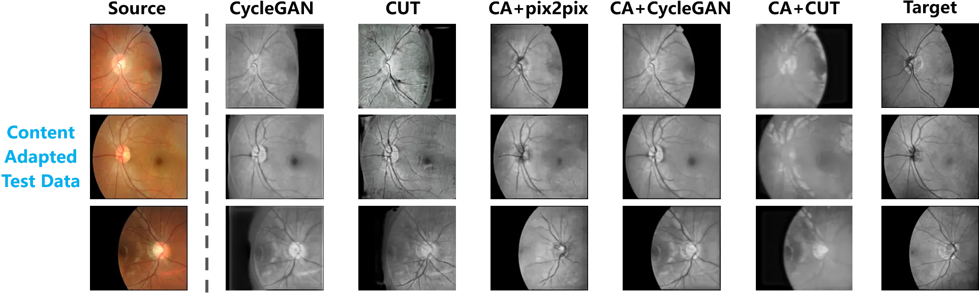 Figure 6. The cross-modality translation tested on the content adapted retinal data. The paired test data are provided by content adaptation. A comparison between the translation outputs and the target samples is thus presented.