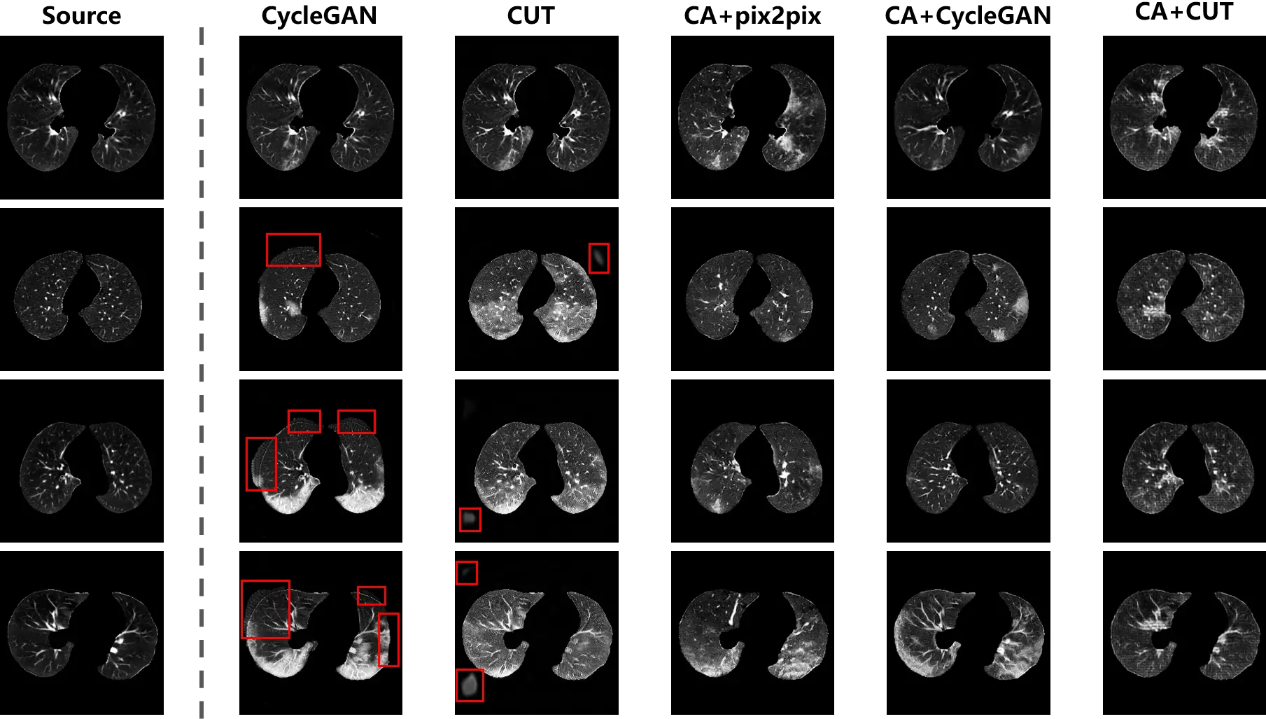Figure 9. The synthesis of CT scans with COVID-19 infection. The distribution bias in the original data leads to hallucinations (i.e. spurious non-anatomical artifacts or unrealistic background structures), as shown by the red boxes. The hallucination has disappeared in the outputs of the translation models trained on content adapted data.