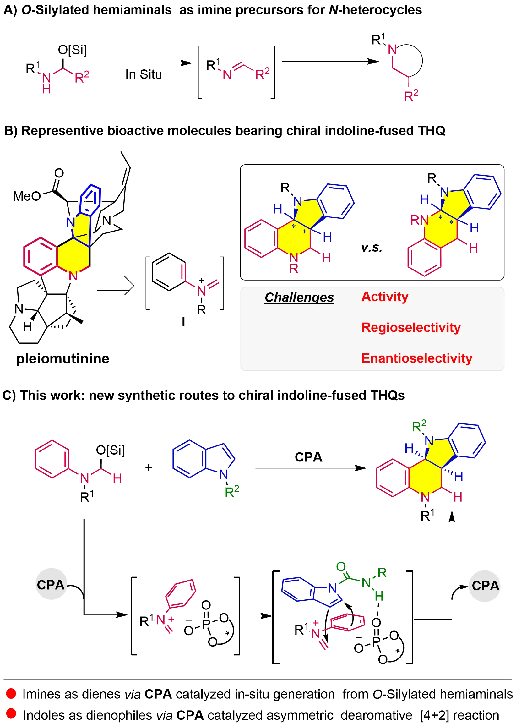 Imines are important synthons in the asymmetric synthesis of chiral nitrogen heterocycles, which constitute a privileged structural motif prevalent in biologically active compounds. The rising percentage of nitrogen heterocycles in approved pharmaceuticals[1] underscores the urgent need to enhance structural diversity in these molecules and advance imine-based synthetic methodologies. In recent years, O-silylated hemiaminals have emerged as highly reactive imine precursors, which can in situ generate various methanimines and thus circumvent several issues inherent to conventional preformed imines (Figure 1A)[2-22]. However, to the best of our knowledge, the chemical space of these imine precursors remains constrained in asymmetric synthesis[23-28], particularly for constructing chiral nitrogen heterocycles[29-31].