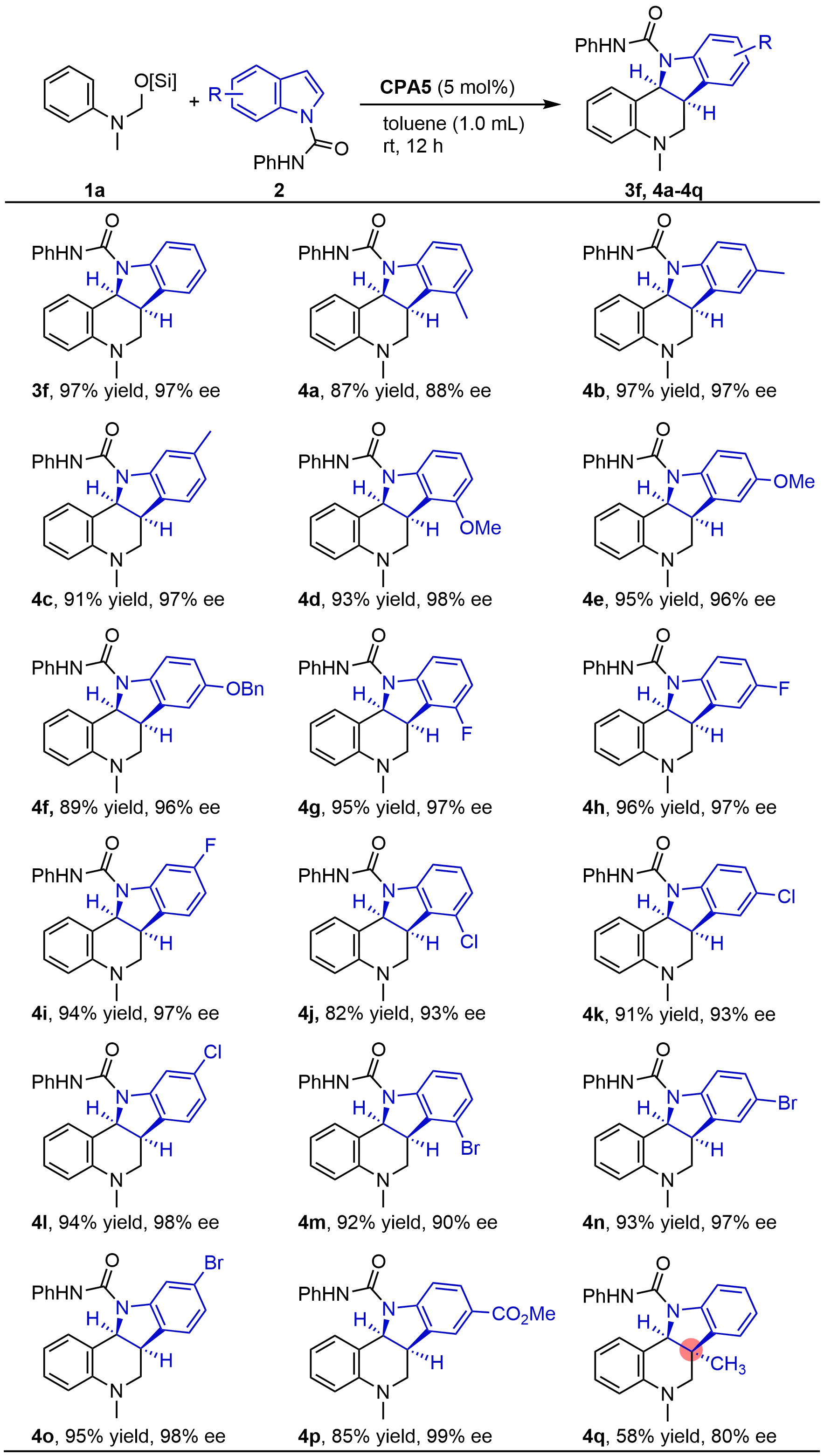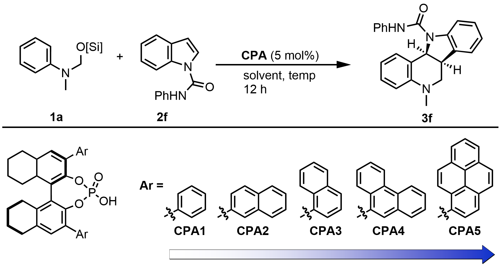 Encouraged by the above initial results, the conditions were further optimized using methanimine precursor O-silylated hemiaminal 1a and N-phenyl-indole-1-carboxamide 2f. As depicted in Table 1, toluene was a better solvent than DCM, DCE, THF, and 1,4-dioxane (entries 1-5). Subsequently, various H8-BINOL-derived CPA catalysts with different steric properties were screened in the reaction (entries 6-9). It was found that the enantioselectivity was strongly responsive to the extent of the substitutions on the 3,3’-positions of the H8-BINOL-framework, with the 1-pyrenyl catalyst CPA5 being optimal (97% yield, 97% ee). The steric demand of the catalyst, together with the potential aryl–aryl interactions with the substrate, was presumably thought to match the less sterically demanding N-phenylmethaniminium substrate and create a tailored microenvironment for asymmetric annulation. In addition, lowering the temperature to 0 °C did not improve the reaction (entry 10).