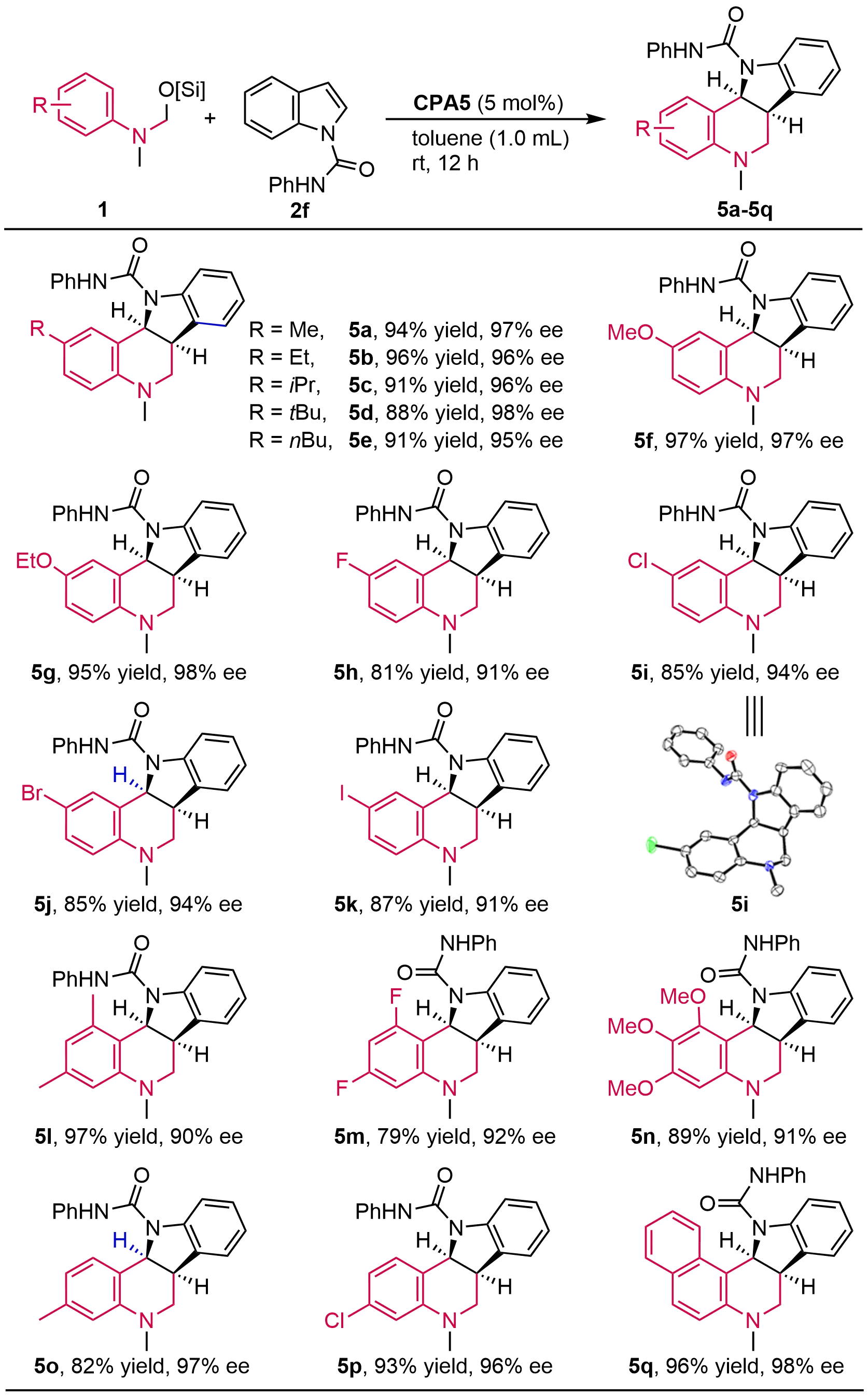 Subsequently, the scope of O-silylated hemiaminals was investigated (Figure 4). Hemiaminals with electron-donating substituents, such as methyl, iso-propyl, tert-butyl, methoxy and ethoxy, underwent the reaction smoothly to afford the indoline-fused THQs with excellent enantioselectivities in high yields (5a-5g, 95 to 98% ee, 88 to 97% yield). Halide substituents including F, Cl, Br and I were well compatible with the reaction to give the corresponding halide-substituted indoline-fused tetrahydroquinolines in high yields and enantioselectivities (5h-5k, 91 to 94% ee, 81 to 87% yield). As expected, 3,5-disubstituted or 3,4,5-trisubstituted N-methyl hemiaminals proceeded smoothly under the conditions to produce the desired indoline-fused tetrahydroquinolines 5l-5n with high enantioselectivities in high yields. Specifically, hemiaminals containing a meta-substituent (methyl and chloro) gave rise to single regioselective products 5o (97% ee, 82% yield) and 5p (96% ee, 93% yield), respectively. Moreover, a 2-naphthyl hemiaminal also produced exclusively tetrahydro-7H-benzo[f]indolo[3,2-c]quinoline 5q with 98% ee and 96% yield. The absolute configuration of 5i was determined by X-ray crystallographic analysis (CCDC 2189145), and other products were assigned by analogy.