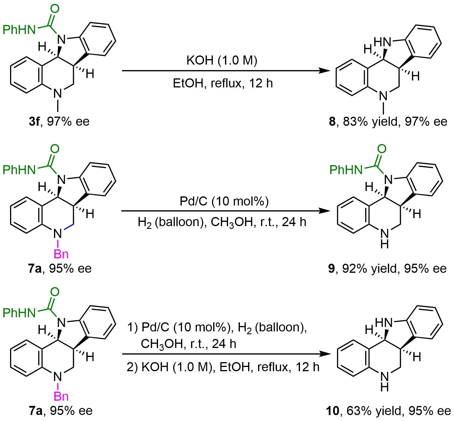 For further synthetic transformation, the directing group PhNHCO- at the indole moiety was conveniently removed in 83% yield and 97% ee (Figure 6). Notably, PhNHCO- at the indole moiety and Bn- at the tetrahydroquinoline moiety of the final products could be selectively removed to afford indoline-fused tetrahydroquinolines bearing free NH groups in high yields without loss of enantiomeric purity, which are more valuable from the perspective of molecular complexity in synthetic chemistry and drug discovery. This merit would also pave the way for late-stage derivatization in more complex polycyclic frameworks.