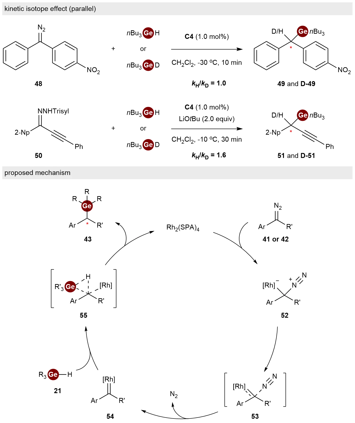 To elucidate the reaction mechanism, they studied the kinetic isotope effect (KIE) in the reactions of carbene precursor 48 and 50 with nBu3GeH or nBu3GeD (Scheme 11). The KIEs of the reactions were 1.0 and 1.6, respectively, suggesting that C–Ge bond formation may not be the rate-limiting step. Based on the results, they proposed a mechanism for the Ge–H bond insertion. The catalytic cycle commences with the coordination of the diazo substrate 41 or 42 to the chiral dirhodium catalyst, forming adduct 52. Subsequent nitrogen extrusion via transition state 53 generates the reactive rhodium-carbene species 54. The electrophilic carbene intermediate 54 undergoes a concerted, irreversible insertion into the Ge–H bond via a three-center transition state 55. DFT calculations further elucidated the origin of stereocontrol, revealing that the excellent enantioselectivity stems from destabilizing steric repulsion between the catalyst ligand and the substrate in the unfavorable transition state, thereby energetically favoring the formation of the chiral organogermane 43.