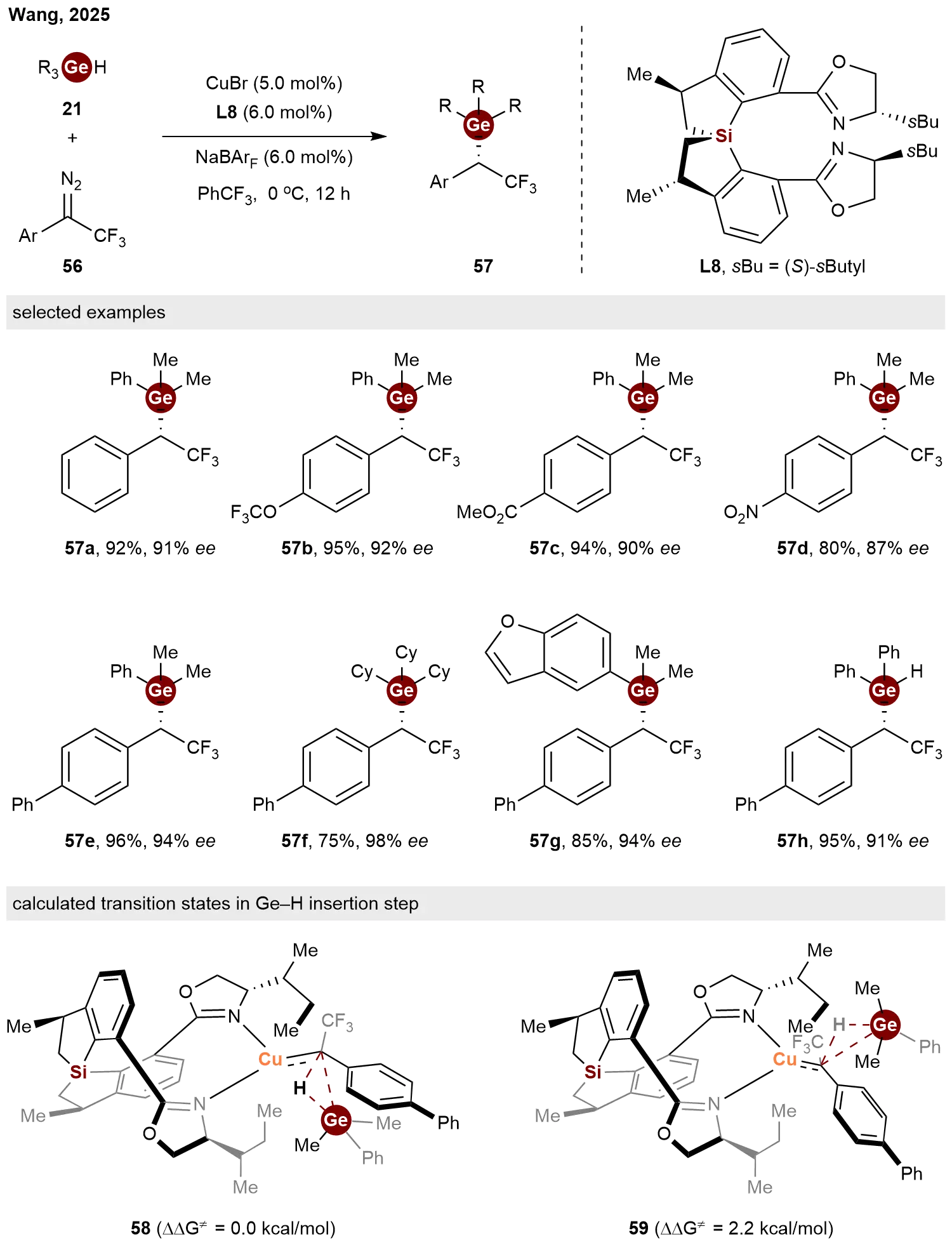 In 2025, Wang and co-workers demonstrated the good performance of chiral spirosilacycle ligands in the Cu-catalyzed asymmetric carbene insertion into Ge–H bonds[32]. Enabled by newly developed C2-symmetrical bisoxazoline ligands L8, the reaction of various