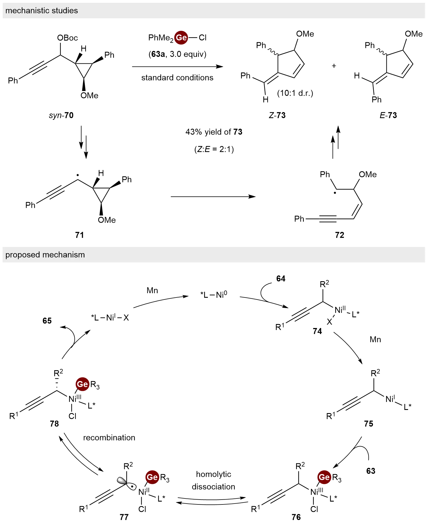 To gain insight into the mechanism of this process, a radical clock experiment was conducted (Scheme 15, top). Under standard conditions, the reaction of cyclopropyl substrate syn-70 with 63a resulted in the ring expanded product 73 at 43% yield with a Z:E ratio of 2:1. This result is consistent with a radical ring-opening/closing process via intermediates 71 and 72. Based on these experimental results and relevant literature precedents, a catalytic cycle was proposed (Scheme 15, bottom). Initially, propargylic ester 64 reacts with Ni(0), followed by reduction with Mn, to generate propargylic Ni(I) species 75. Subsequent oxidative addition of 75 to chlorogermane 63 yields Ni(III) complex 76. Reversible homolytic cleavage of the Ni–C bond in 76, followed by recombination between the resulting Ge–Ni(II)X species and the propargyl radical via intermediate 77, produces enantioenriched complex 78. Finally, stereospecific reductive elimination from 78 delivers the desired chiral product 65.
