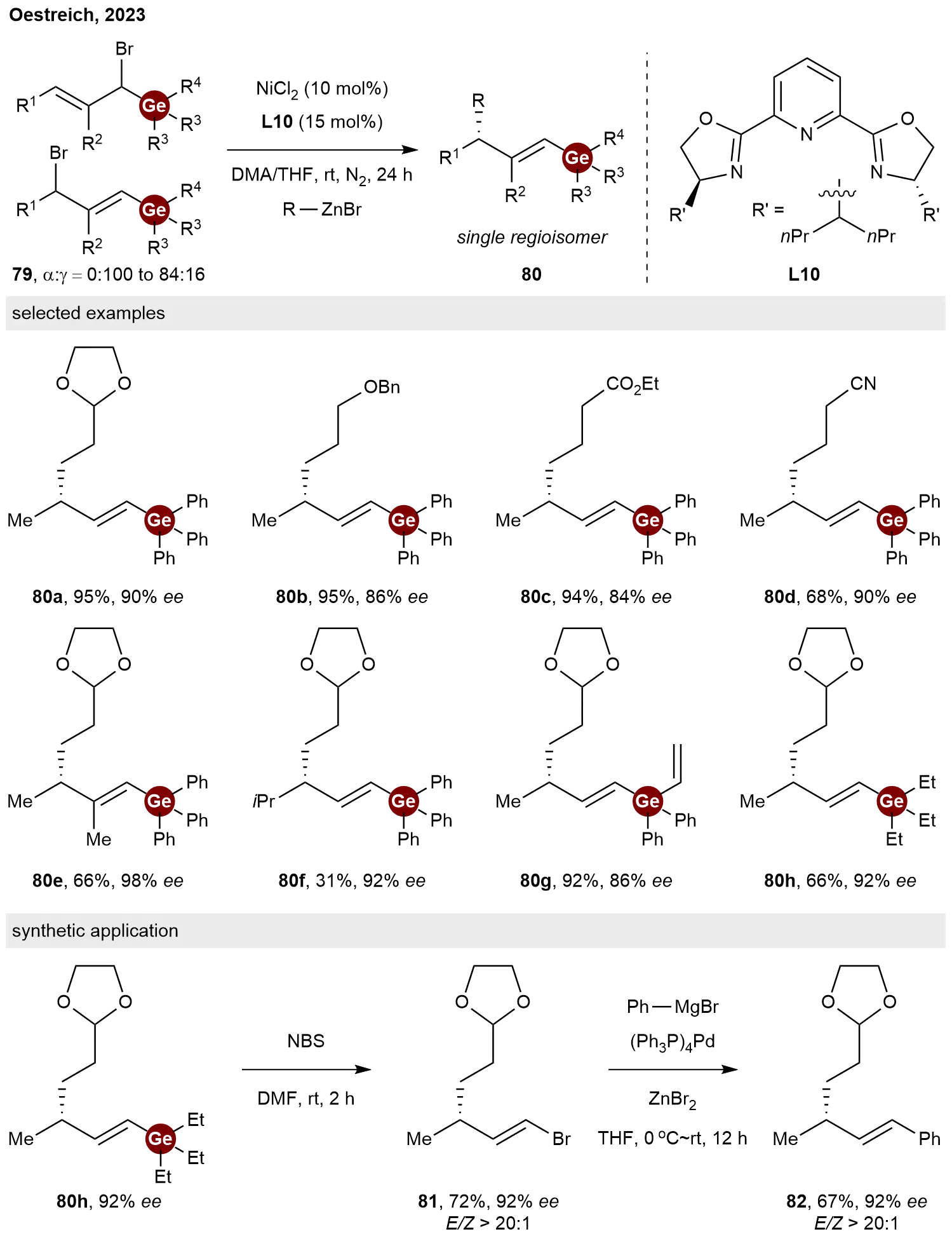 In addition to the aforementioned asymmetric C–Ge coupling approach for synthesizing C-stereogenic germanes, an alternative strategy involves the asymmetric C–C coupling between germylated allylic electrophiles and alkyl nucleophiles. In 2023, Oestreich and co-workers developed a nickel-catalyzed enantio- and regioconvergent cross-coupling of regioisomeric mixtures of racemic germylated allylic electrophiles 79 with alkylzinc reagents[41]. The success of this method relies on a newly designed