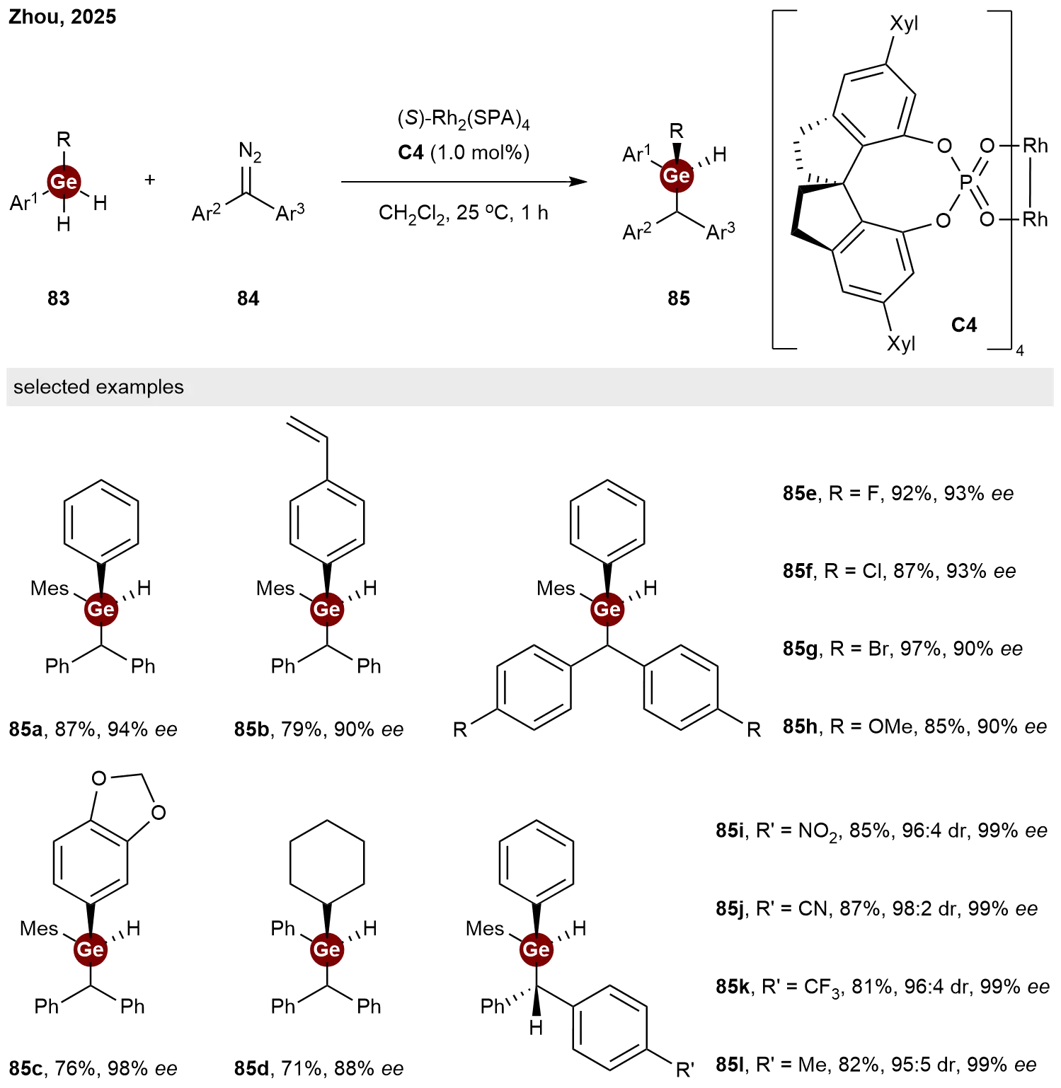 Scheme 10. Rhodium-catalyzed enantioselective C–Ge bond formation by carbene insertion.