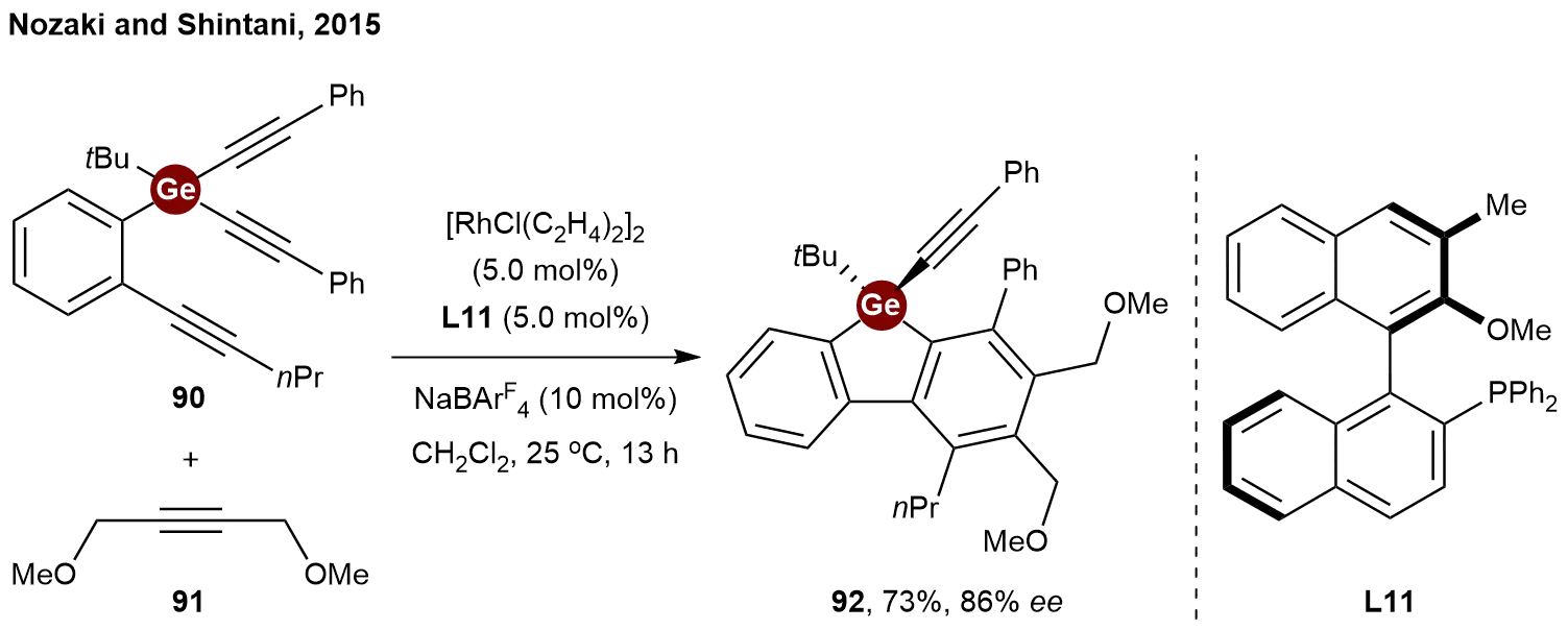 The pioneering example of transition-metal-catalyzed desymmetrization of tetraorganogermanes was reported by Nozaki and Shintani in 2015[43]. By extending the rhodium-catalyzed [2+2+2] cycloaddition strategy to heavier group 14 elements, they achieved the desymmetrization of germanium-containing triyne 90 with alkyne 91 by using the axially chiral monophosphine ligand L11