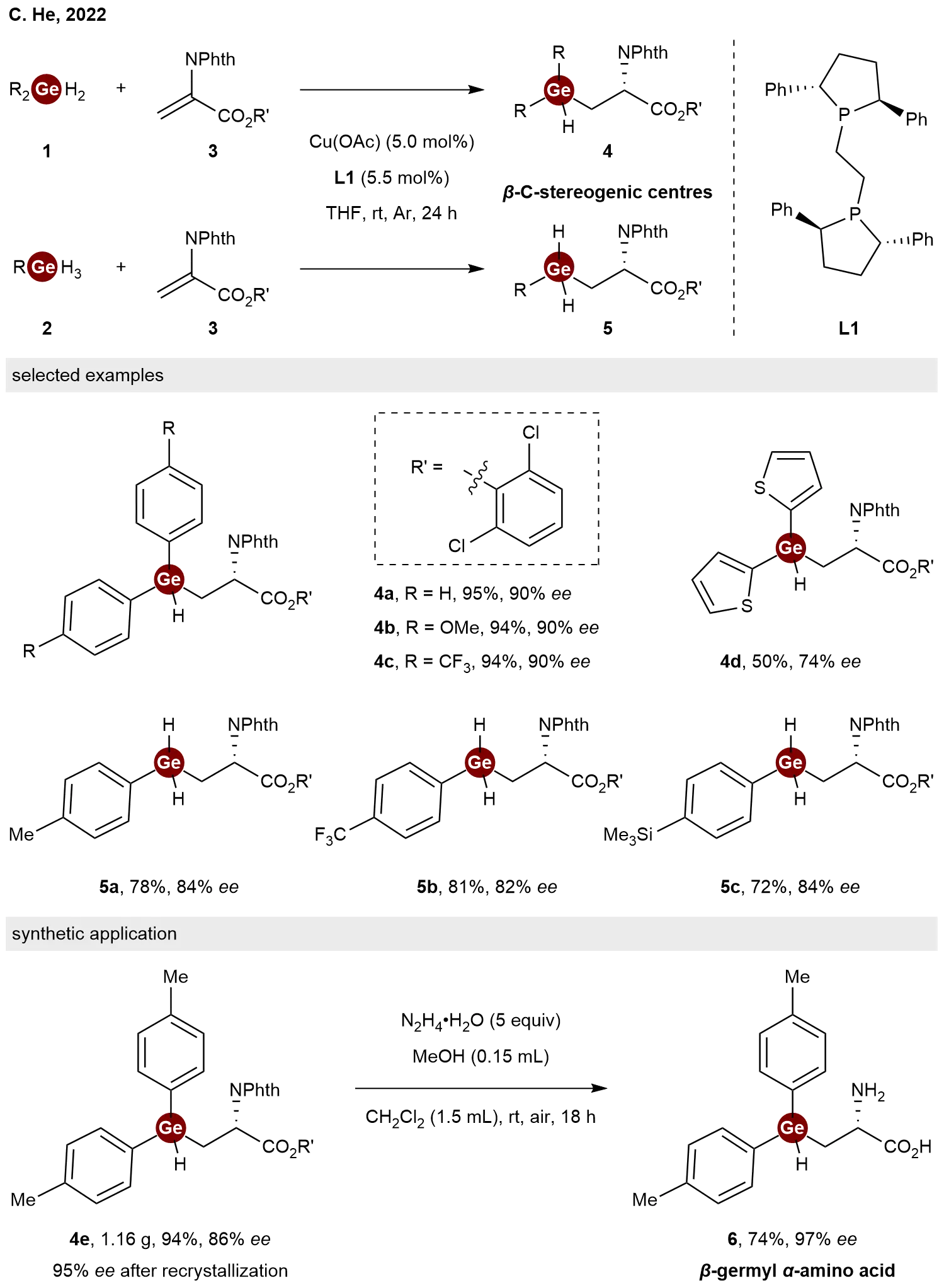 Hydrogermylation of alkenes represents one of the most straightforward and atom-economic approaches for the construction of organogermanium compounds[14]. Despite considerable progress in hydrogermylation methodologies over the past decades, achieving an enantioselective variant has remained a formidable challenge. In 2022, He and co-workers achieved a breakthrough by reporting a copper-catalyzed enantioselective intermolecular hydrogermylation of dehydroalanines 3 with dihydrogermanes 1 and trihydrogermanes 2[15]. By employing a catalytic system consisting of Cu(OAc) and the chiral bisphosphine ligand (S,S)-Ph-BPE L1, this process gave access to a variety of chiral β-germyl α-amino acid derivatives 4 and 5 in decent yields with good to excellent enantioselectivities (Scheme 2). This work represents the first example of a catalytic enantioselective hydrogermylation of alkenes. To underscore the synthetic utility of the method, the authors demonstrated that hydrazine mediated deprotection of product 4e yielded the fully deprotected β-germyl α-amino acid 6 without erosion of enantiopurity, highlighting the robustness of the stereocenter under the reaction conditions.