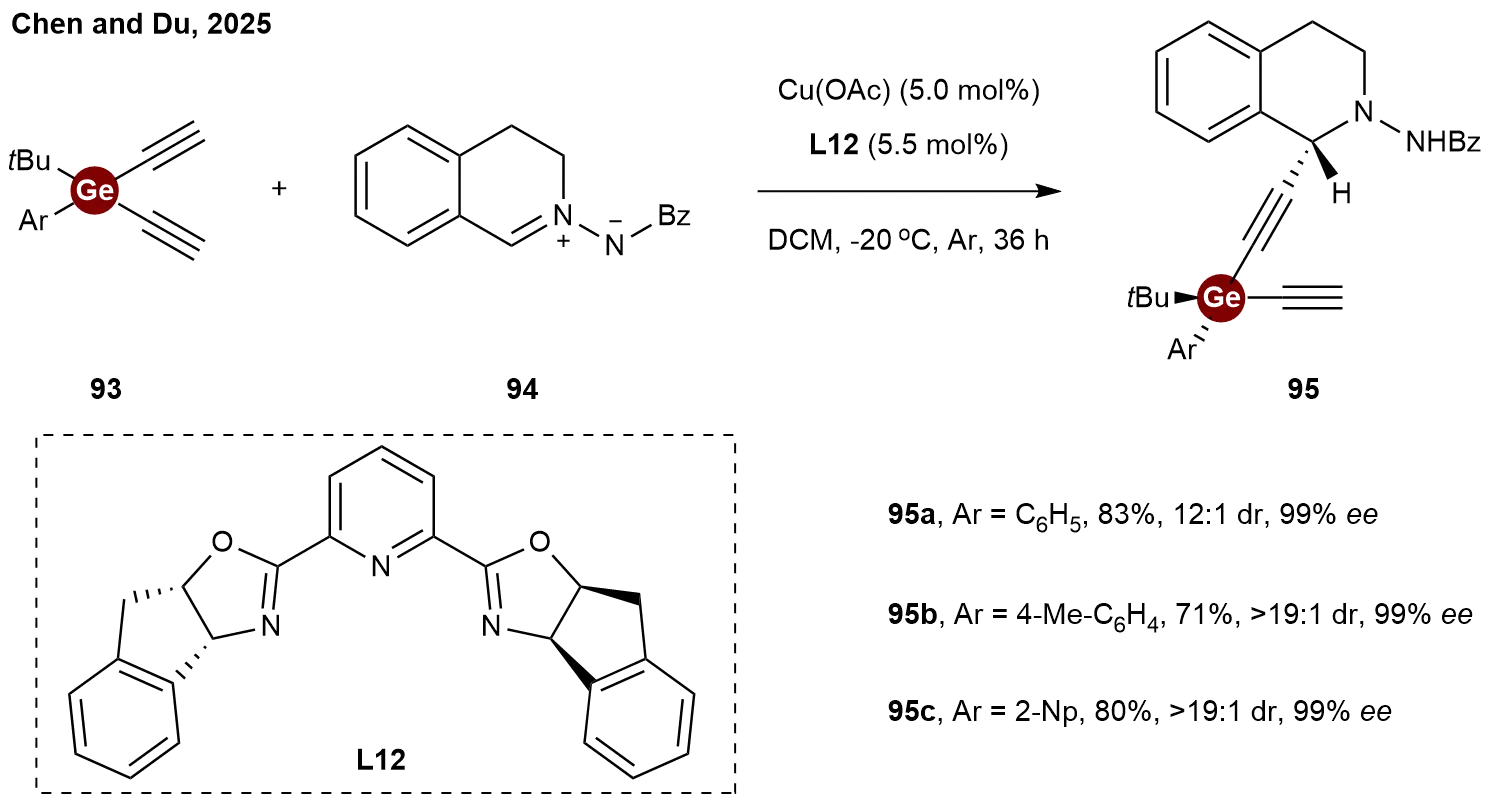 The installation of distant stereogenic centers (such as 1,4-positioned centers) in acyclic systems remains a formidable challenge. In 2025, Chen and Du reported a copper-catalyzed asymmetric alkynylation of C, N-cyclic azomethine imine 94 with dialkynylgermanes 93 (Scheme 20)[44]. This methodology afforded enantioenriched propargylic germanes 95 with high diastereo- and enantioselectivities. This sequential asymmetric deprotonation-alkynylation approach, mediated by a single chiral catalyst, offers a reliable and efficient method for the diastereo- and enantioselective synthesis of products featuring conventionally difficult-to-access rectilinear