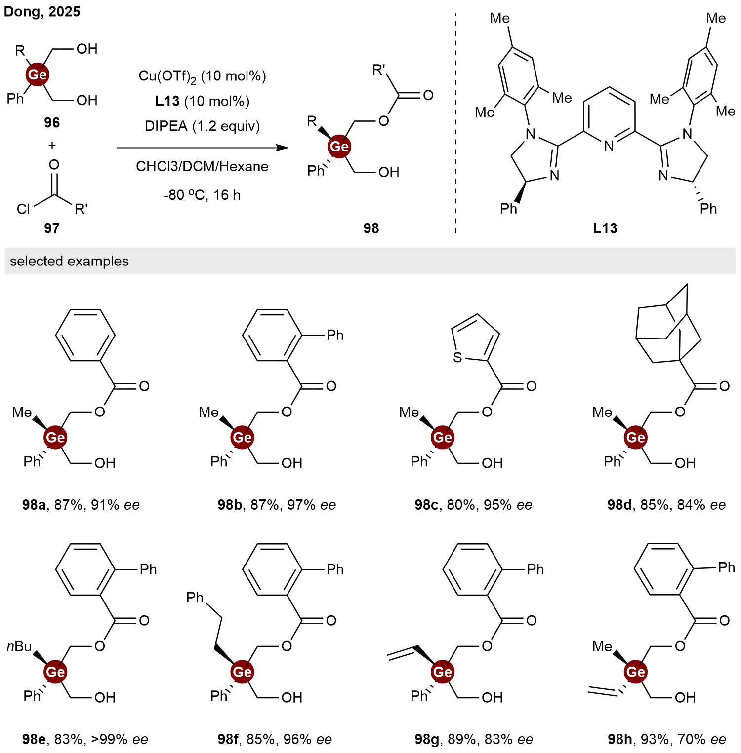 In addition to constructing Ge-stereogenic centers through the desymmetrization of germanium-containing bis-alkynes, germanium-based 1,3-diols have also been demonstrated to serve as viable prochiral substrates. In 2025, Dong and co-workers reported a copper-catalyzed desymmetrization of diols to access chiral germanium centers[45]. Employing a pyridine-bisimidazoline L13 as the chiral ligand and acyl chlorides 97 as acylating agents, the hydroxyl groups of diol substrate 96 were selectively