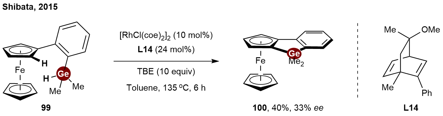 In recent years, the asymmetric catalytic synthesis of other chiral germanes has also been reported. Parallel to the reports by Takai and He on the enantioselective synthesis of silicon-bridged planar-chiral ferrocenes in 2015[46,47], Shibata and co-workers independently disclosed a similar rhodium-catalyzed intramolecular dehydrogenative coupling strategy[48]. Notably, while concurrent studies focused predominantly on silylation, they successfully expanded the scope of this methodology to the heavier congener, germanium. By using a Rh/chiral diene L14 catalyst with tert-butyl ethylene (TBE) as a hydrogen acceptor, the intramolecular C–H/Ge–H dehydrogenative coupling of 2-(dimethylhydrogermyl) phenylferrocene 99 proceeded to afford benzogermoloferrocene 100 in 40% yield with 33% ee