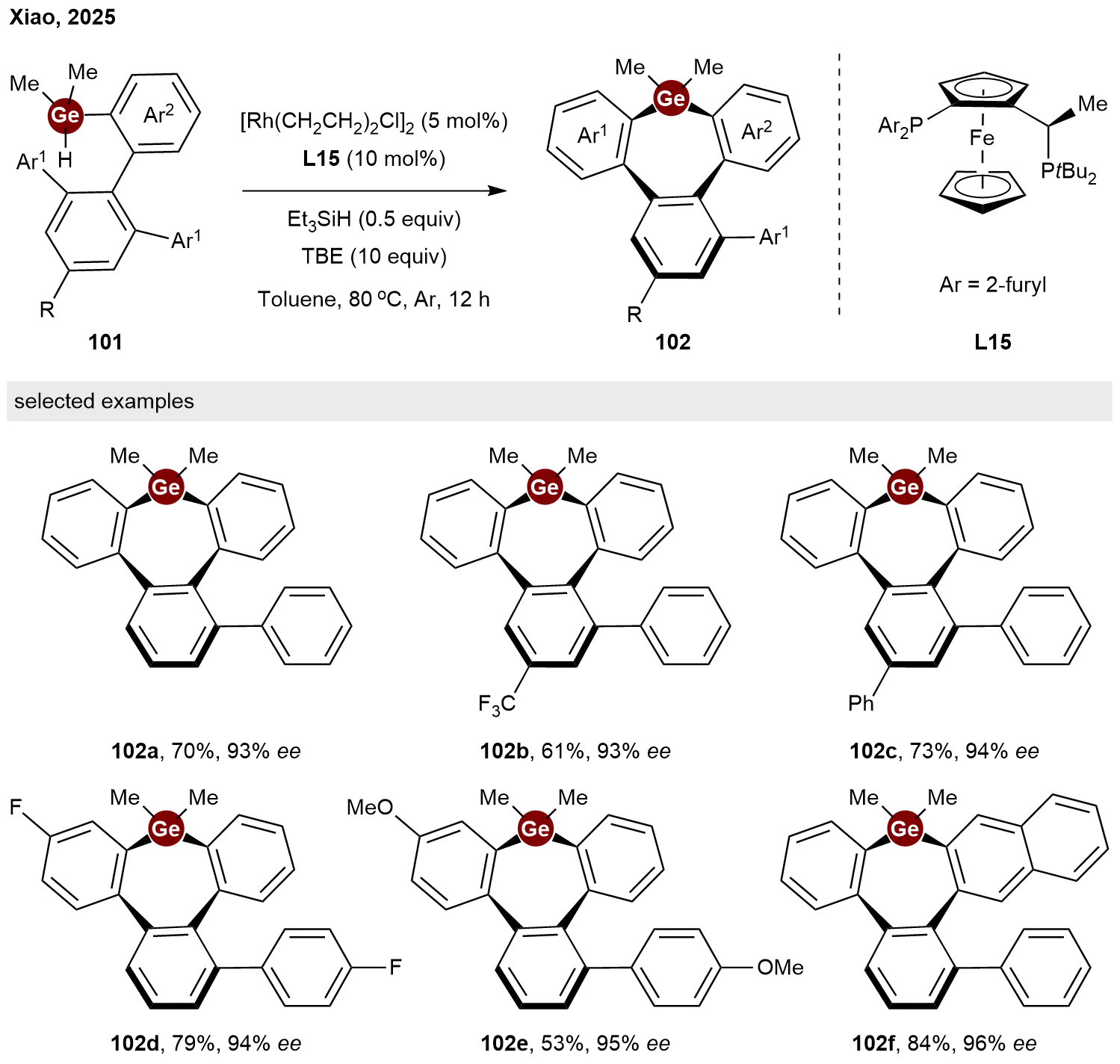 Recently, Xiao and co-workers extended the rhodium-catalyzed enantioselective intramolecular C–H/Ge–H dehydrogenative coupling strategy to the synthesis of inherently chiral germanes[49]. Employing the chiral Josiphos-type ligand L15, a series of inherently chiral tribenzogermepins 102 were successfully synthesized via this intramolecular asymmetric C–H germylation of hydrogermane precursors 101 in moderate to high yields with excellent stereoselectivity (Scheme 23).