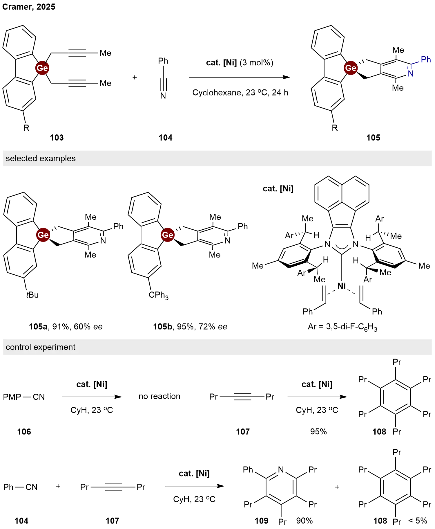 In 2025, Cramer and co-workers reported a unified strategy for the construction of chiral spirocyclic skeletons via nickel-catalyzed enantioselective hetero [2+2+2] cycloaddition[50]. A chiral designer Ni(0) N-heterocyclic carbene complex cat. [Ni] enables the required long-range enantioinduction. After demonstrating its broad utility for synthesizing carbon- and boron-centered spirocycles, they successfully extended this protocol to the chiral spirogermanium center. When dialkynylgermanes 103 and benzonitrile 104 were selected as substrates for this hetero [2+2+2] cycloaddition, the target spiro germafluorene 105a and 105b were obtained in 91% and 93% yields with 60% and 72% ee, respectively (Scheme 24). To shed some light on the reaction mechanism, some control experiments were conducted. No reaction occurred between precatalyst cat. [Ni] and p-methoxybenzonitrile 106, indicating that nickel has a stronger affinity for styrene than nitrile and that coordination of the nitrile is contingent following ligand exchange of styrene with alkyne substrate. In the absence of a nitrile, cat. [Ni] cleanly catalyzed trimerization of alkyne 107 to afford 108 in 95% yield; however, the formation of pyridine 109 is largely favored in its presence. This indicates that pyridine formation proceeds much faster than cyclotrimerization of alkyne. These experimental results support that the reaction proceeds by a heterocoupling mechanism in which one of the alkynes and the nitrile link together first.