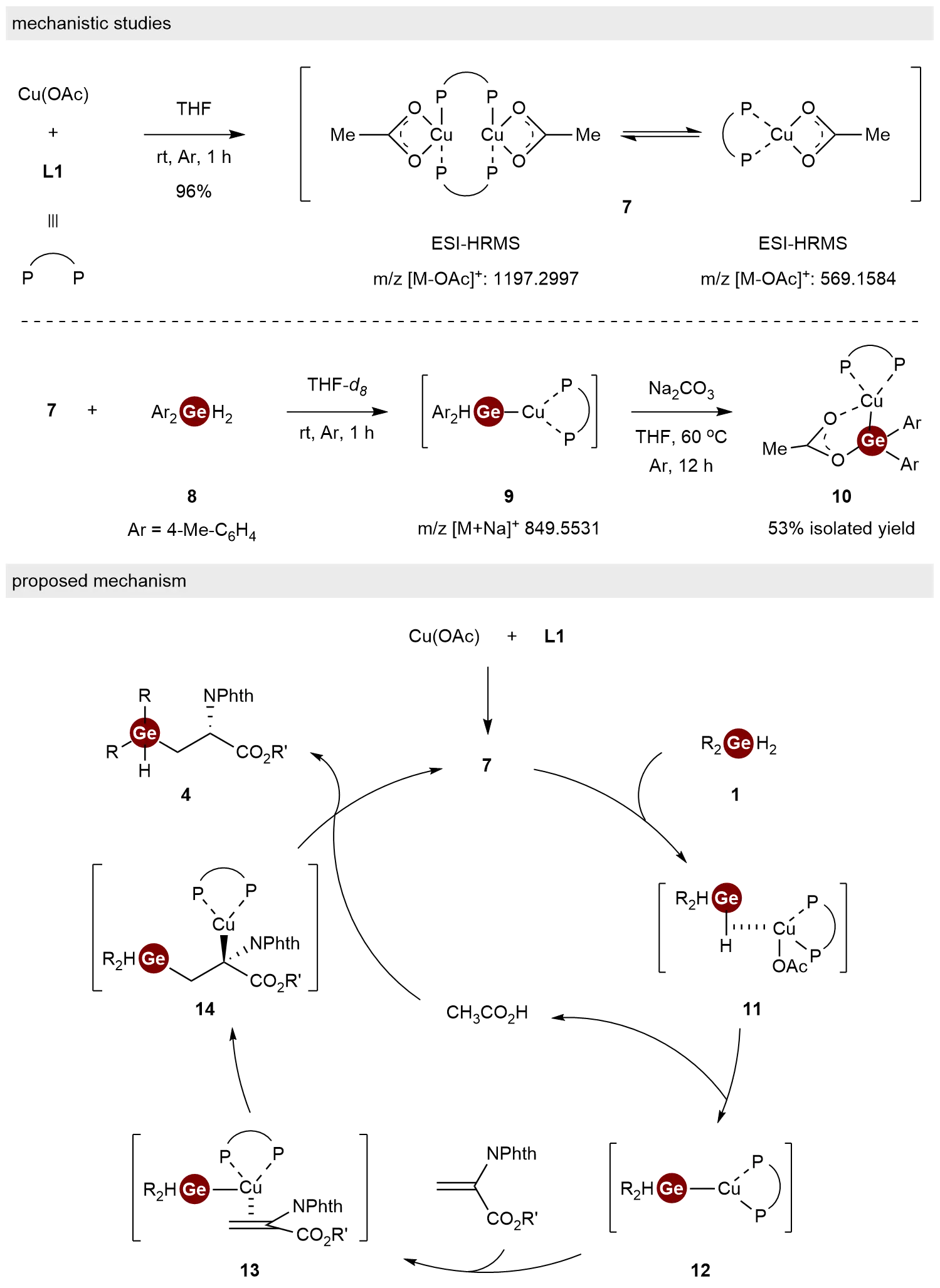 To investigate the reaction mechanism of this hydrogermylation process, a series of experimental studies were conducted (Scheme 3). Initially, the stoichiometric reaction of Cu(OAc) with L1 yielded complex 7 in 96% isolated yield. Analysis by 1H NMR, 31P NMR, X-ray crystallography, and ESI-HRMS revealed that there were two components (dimer and monomer) in complex 7. Subsequent ESI-HRMS monitoring of the reaction between complex 7 and dihydrogermane 8 indicated the formation of a [Cu–Ge] species 9, which was subsequently trapped and structurally characterized by X-ray crystallography as the stabilized complex 10. Notably, this behavior contrasts with previously reported reactions of Cu complexes with hydrosilanes, which typically lead to the formation of [Cu–H] species[16]. On the basis of these findings, a plausible catalytic cycle was proposed: First, the reaction between Cu(OAc) and L1 generated the active catalytic species complex 7. Then, coordination between dihydrogermanes 1 and complex 7 formed complex 11, followed by the formation of [Cu–Ge] species 12 with the release of CH3CO2H. Next, the coordination and nucleophilic addition of complex 12 to dehydroalanine occurred, producing complexes 13 and 14 subsequently. Finally, the protonation of intermediate 14 by CH3CO2H afforded the desired product 4 and regenerates complex 7, thereby completing the catalytic cycle.