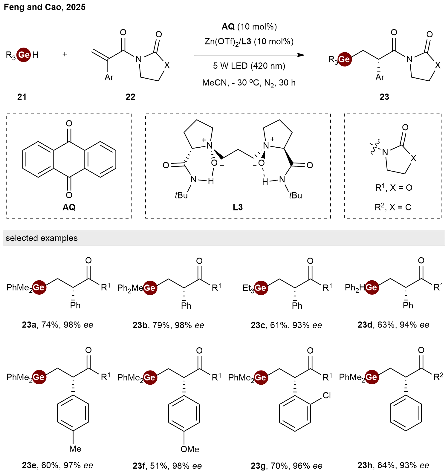 In addition to transition-metal catalysis, chiral Lewis acid catalysis also serves as an effective approach for asymmetric hydrogermylation reactions. Taking advantage of the unique chiral N,N′-dioxide ligand[18], in 2025, Chen and co-workers reported a synergistic catalytic strategy for enantioselective hydrogermylation of α,β-unsaturated amides 22 with germanes 21[19]. This system integrates anthraquinone (AQ) as a dual-functional photocatalyst with a chiral Lewis acid catalyst derived from Zn(OTf)2 and ligand L3. This approach demonstrates broad substrate scope. A variety of chiral organogermanes 23 bearing α-C-stereogenic centers were afforded in high yields with good chemo-, regio and enantioselectivities (Scheme 5).