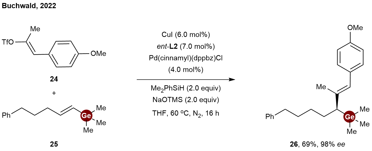 Diverging from the aforementioned hydrogermylation strategies centered on Ge–H bond activation, alternative hydrofunctionalization of vinylgermanes has also been developed. In these transformations, the germanium moiety does not participate in bond cleavage, remaining intact throughout the bond-forming process. In 2022, Buchwald and co-workers disclosed a protocol for the asymmetric synthesis of α-stereogenic allyl metalloids via dual CuH- and Pd-catalyzed hydroalkenylation[20]. Although the study primarily focused on silicon and boron substrates, its applicability was successfully extended to organogermanium chemistry. Under optimized conditions employing CuI/ent-L2 and Pd(cinnamyl)(dppbz)Cl as dual catalysts, the enantioselective hydroalkenylation of vinylgermane 25 with enol triflate 24 afforded the chiral organogermane 26 in 69% yield with 98% ee (Scheme 6).