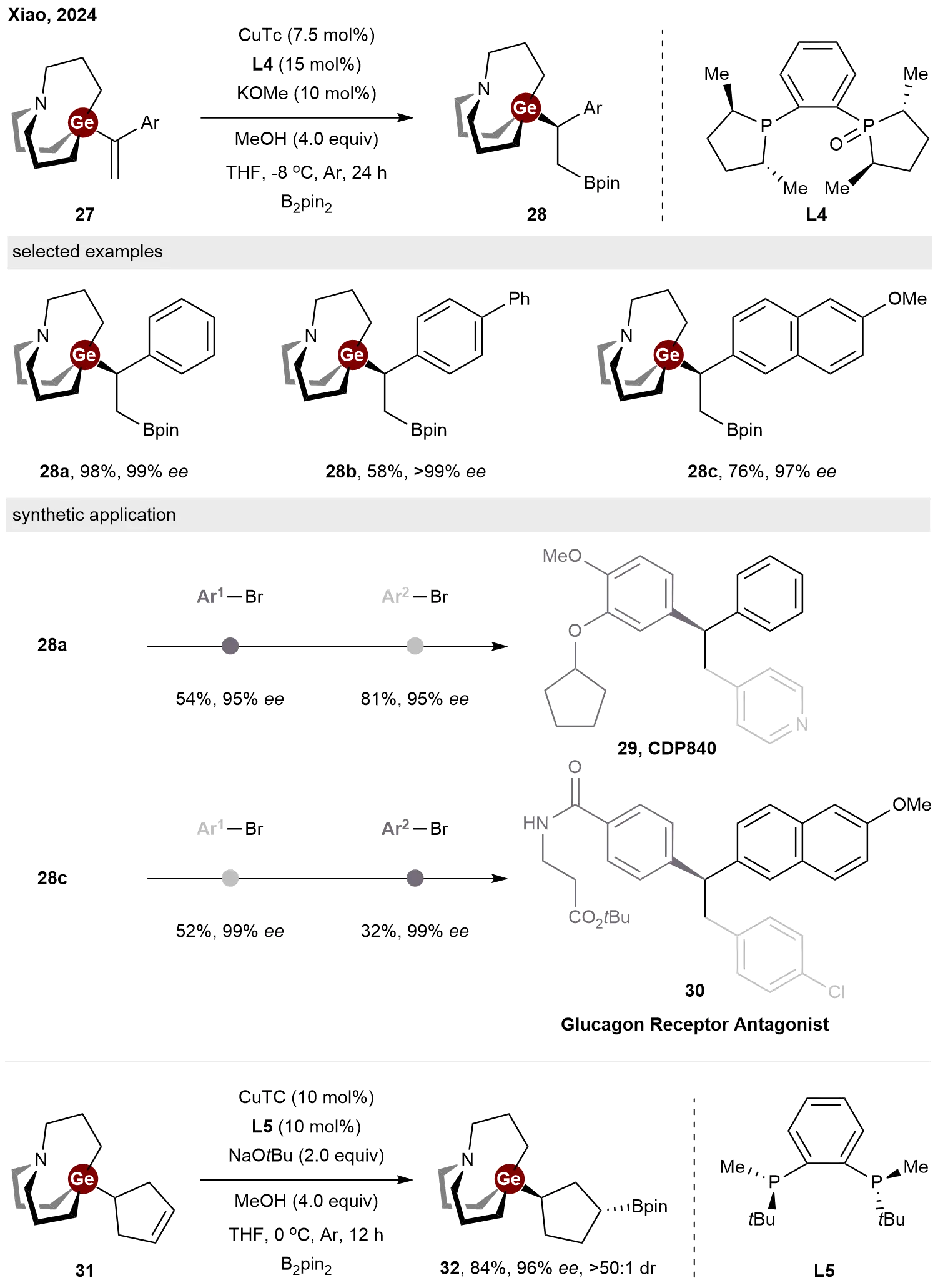 In 2024, Xiao and co-workers reported a copper-catalyzed enantioselective hydroboration of vinylgermanes[21]. In this study, carbagermatrane-containing alkenes 27 underwent hydroboration in the presence of the CuTc/L4 catalyst, yielding target products 28 in moderate to good yields and excellent enantioselectivities (Scheme 7). These sp3-Ge/B bimetallic modules demonstrated remarkable orthogonal cross-coupling selectivity under different Pd-catalyzed conditions. For example, enantioenriched 29 and 30 can be readily prepared via -Ge/-B iterative cross-coupling sequence or -B/-Ge iterative cross-coupling sequence from 28a and 28c. They also expanded this asymmetric hydroborylation strategy to cyclopent-3-ene-1-carbagermatrane 31. This allowed rapid access to highly enantioenriched cyclopentyl-Ge/B module 32, which may serve as a useful building block for the construction of valuable 3D cyclopentyl molecules.