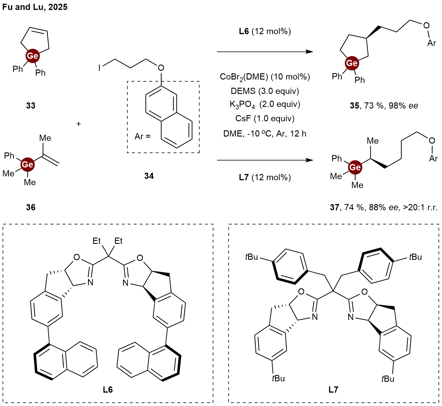 In 2025, Fu and Lu achieved the extension of their well-established cobalt-catalyzed alkene hydroalkylation strategies[22] to the synthesis of chiral organogermanium compounds[23]. They showcased the versatility of their catalytic platform by successfully extending it to germanium-containing alkenes. Employing the chiral bisoxazoline ligand L6, the hydroalkylation of