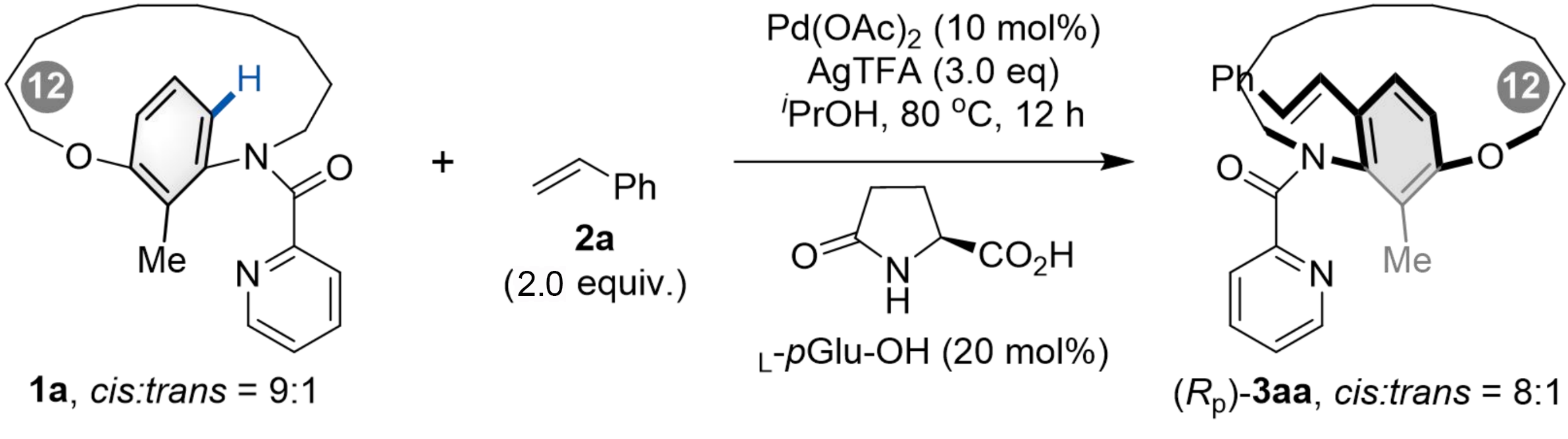 a: Reaction conditions: 1a (0.1 mmol), 2a (0.2 mmol, 2.0 equiv.), Pd(OAc)₂ (0.01 mmol, 10 mol%), L-pGlu-OH (0.02 mmol, 20 mol%), and oxidant (0.3 mmol, 3.0 equiv.) in iPrOH (2.0 mL). The mixture was stirred at 80 °C for 12 h under air. cis/trans ratio was determined by ¹H NMR analysis; b: The yields were determined by 1H NMR with 1,3,5-trimethoxybenzene (1/3 equiv.) as an internal standard; c: Enantiomeric excess (ee) was determined by HPLC on a chiral stationary phase; d: Yield refers to isolated yield. Numbering in grey circles indicates ansa chain length. ee: enantiomeric excess; TFE: trifluoroethanol; DME: 1,2-dimethoxyethane.