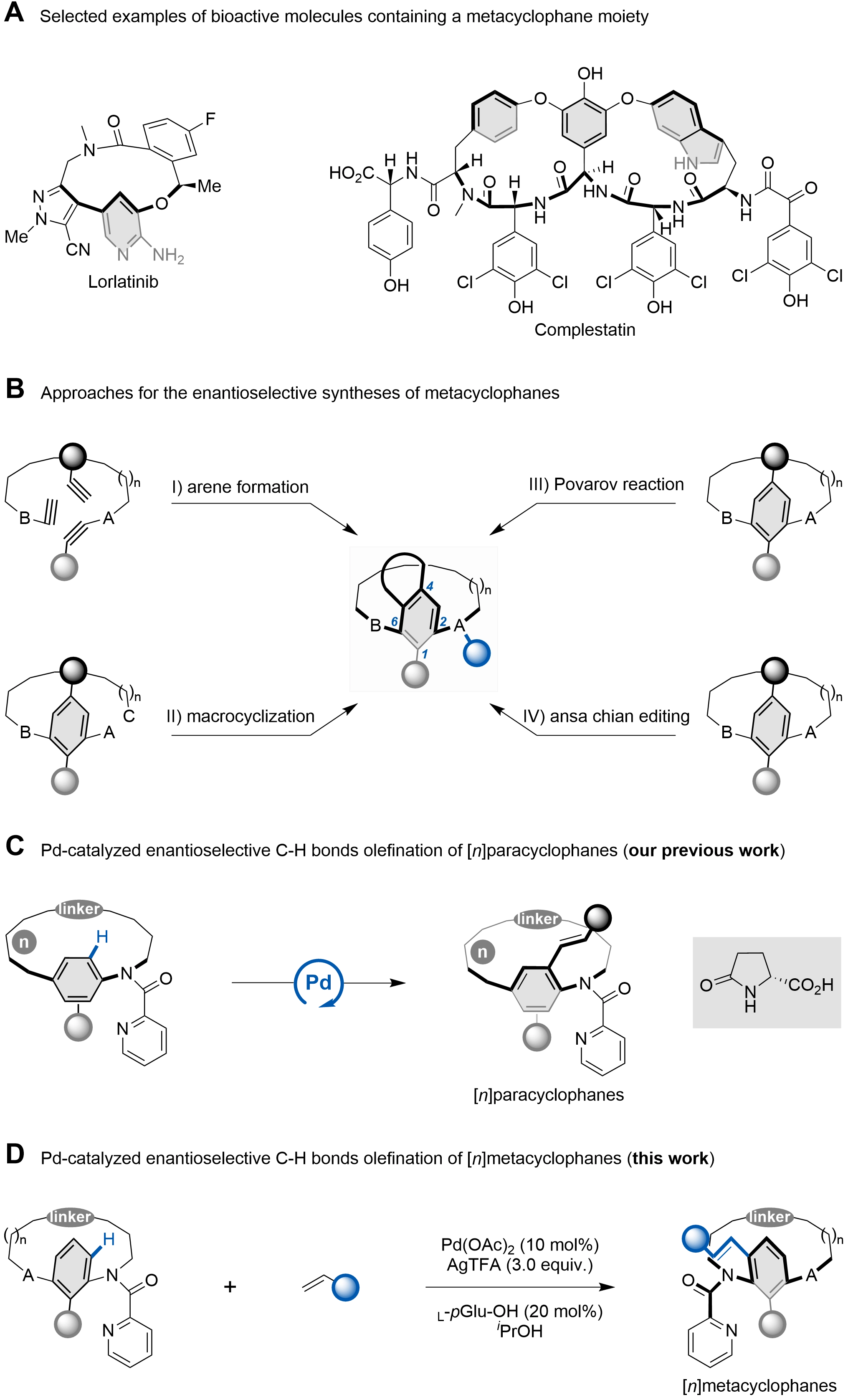 The Pd/pGlu-catalyzed atroposelective C–H olefination has been well established for constructing enantioenriched scaffolds[55-67]. For example, Shi and co-workers developed an elegant picolinamide-directed asymmetric C–H olefination to access axially chiral anilides[59]. This catalytic system was subsequently extended to the construction of N–aryl peptide atropisomers and axially chiral styrenes[60-62]. More recently, we employed the Pd/pGlu platform in the late-stage C–H functionalization of cyclophanes, providing efficient access to diverse planar-chiral paracyclophanes (Scheme 1C)[40-42]. We hypothesized that the same strategy could be applicable to the atroposelective synthesis of metacyclophanes. Herein, we report a Pd-catalyzed late-stage C–H olefination of metacyclophanes enabled by a monoprotected amino acid ligand (Scheme 1D). Furthermore, our study revealed that introducing a picolinamide group onto the ansa chain offers additional conformational stabilization for the resulting metacyclophanes.