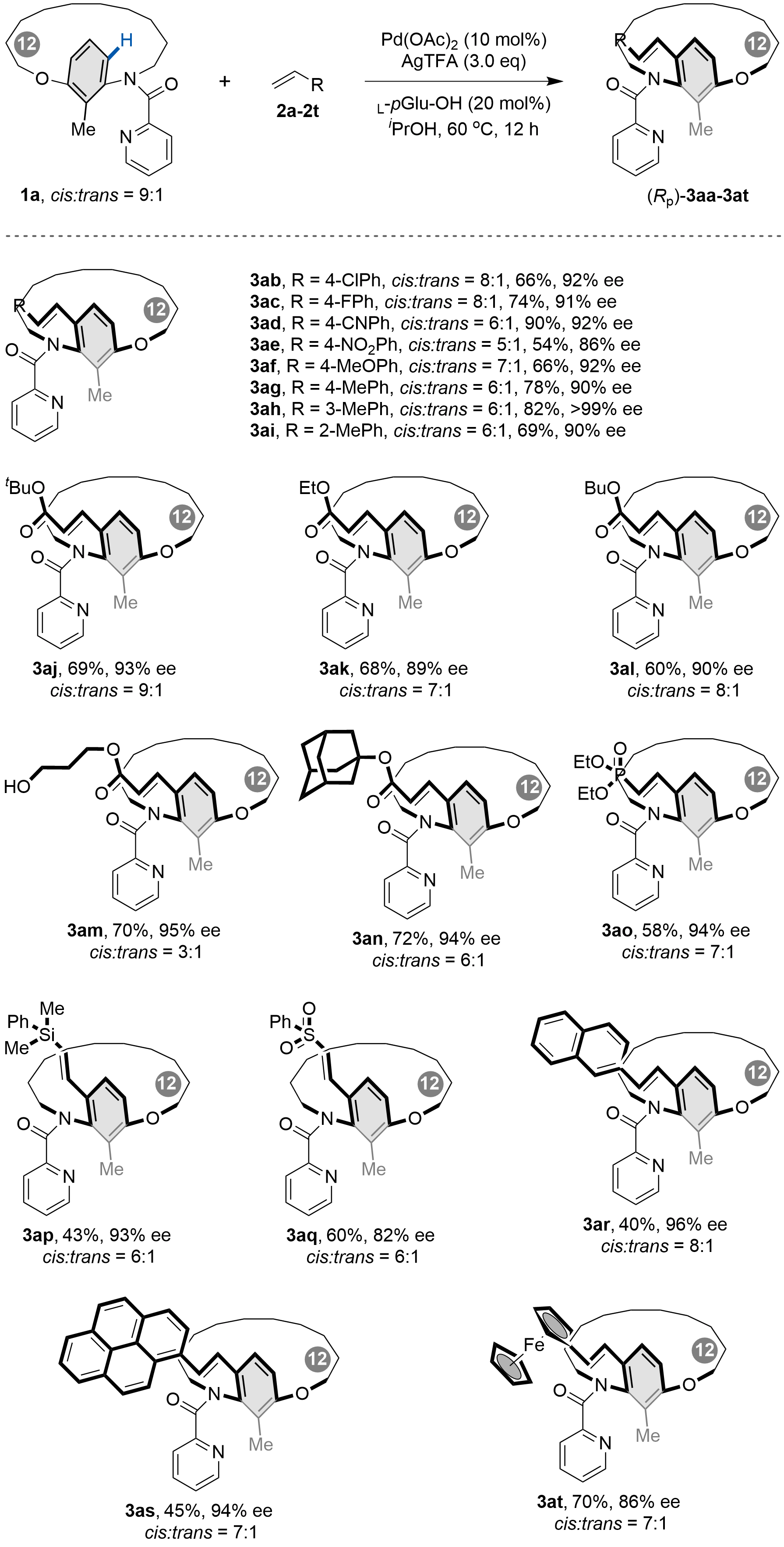 After establishing the optimal reaction conditions, we evaluated the substrate scope of alkenes in the Pd-catalyzed C–H olefination for the synthesis of [n]metacyclophanes (Scheme 2). Substituted vinylarenes with electron-neutral, electron-donating, and electron-withdrawing groups all proved compatible (3aa-3ai), affording [12]metacyclophanes in moderate to good yields with high to excellent enantioselectivities. Notably, substitution at the 3-position of the benzene ring further improved enantiocontrol (3ah, > 99% ee). A range of acrylates, including sterically hindered derivatives, also reacted smoothly to deliver the corresponding products (3aj-3an) in good yields with high enantioselectivities. Moreover, substrates bearing other functional groups, such as phosphate acrylate, dimethyl(phenyl)silane, and phenyl sulfone, were also suitable, providing [12]metacyclophanes (3ao-3aq) in moderate to good yields with high enantioselectivities. Additionally, vinylarenes including 2-vinylnaphthalene, 1-vinylpyrene, and vinylferrocene were efficiently transformed into the target metacyclophanes (3ar-3at).